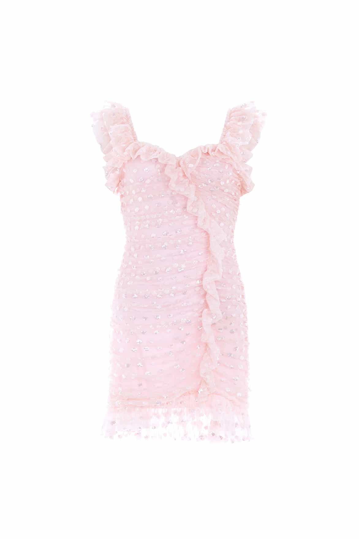 The Dotty Ruched Gloss Micro Mini Dress in Peony Pink. This mini dress is adorned with scattering sequins throughout, adding an all over romantic shimmering effect. The outside shell of this dress is created in our signature soft tulle. Gently gathered and perfectly engineered around the body to create the most flattering bodycon silhouette. The lining of this style in made in stretch power mesh, enabling a figure-hugging shape with ultimate comfort and fit. Contours to the body and hugs in all the right places