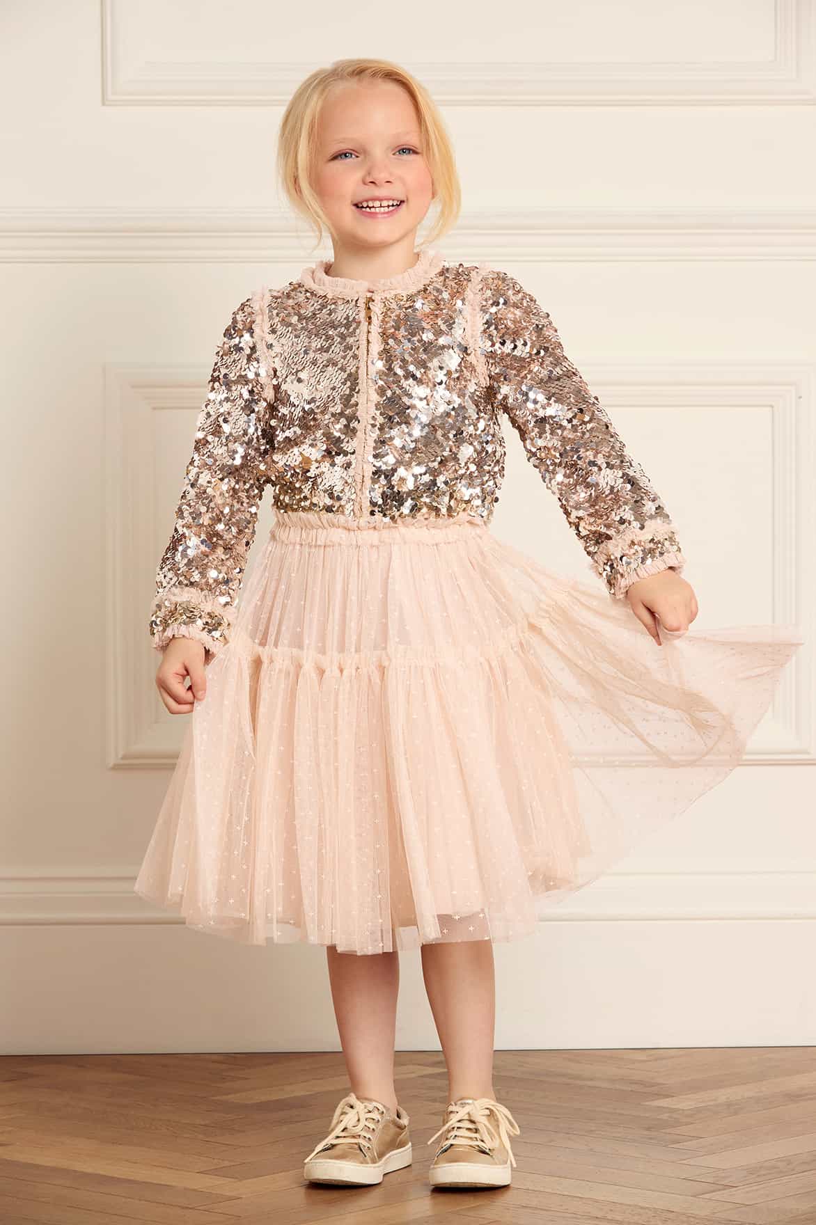 The Hallie KIDS Bomber Jacket in Silver. Reintroducing a signature archive product: The Needle & Thread bomber jacket. This playful cropped bomber is designed to be styled with our Tulle KIDS Skirt for the prettiest statement co-ord. Developed with signature frills on the cuffs, shoulders, and around the zip, creating a frothy texture. This charming piece is embellished with a specially developed all-over sequin fabric, made by intricately applying delicate side-hole sequins that overlap to form a decadent, luxe, shimmering effect. This bomber will be the star of their wardrobe.