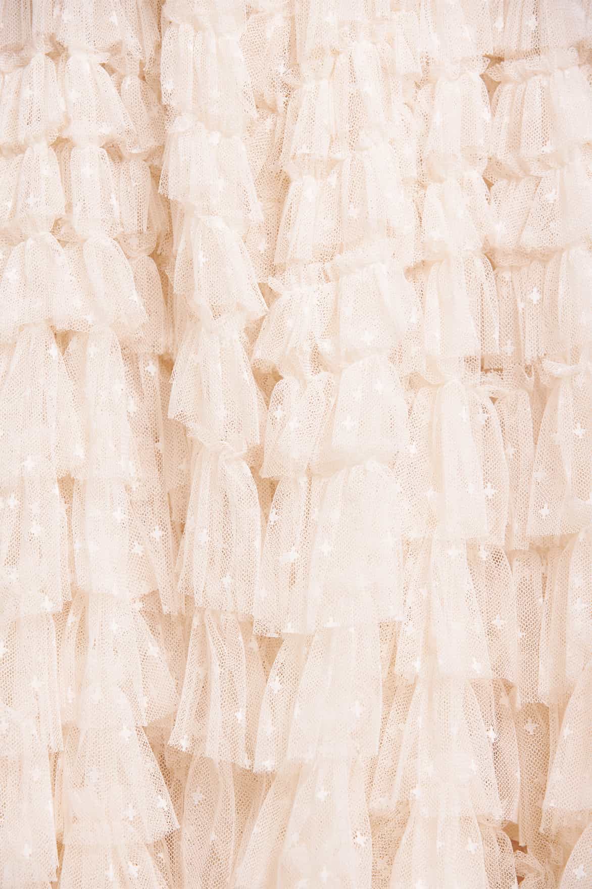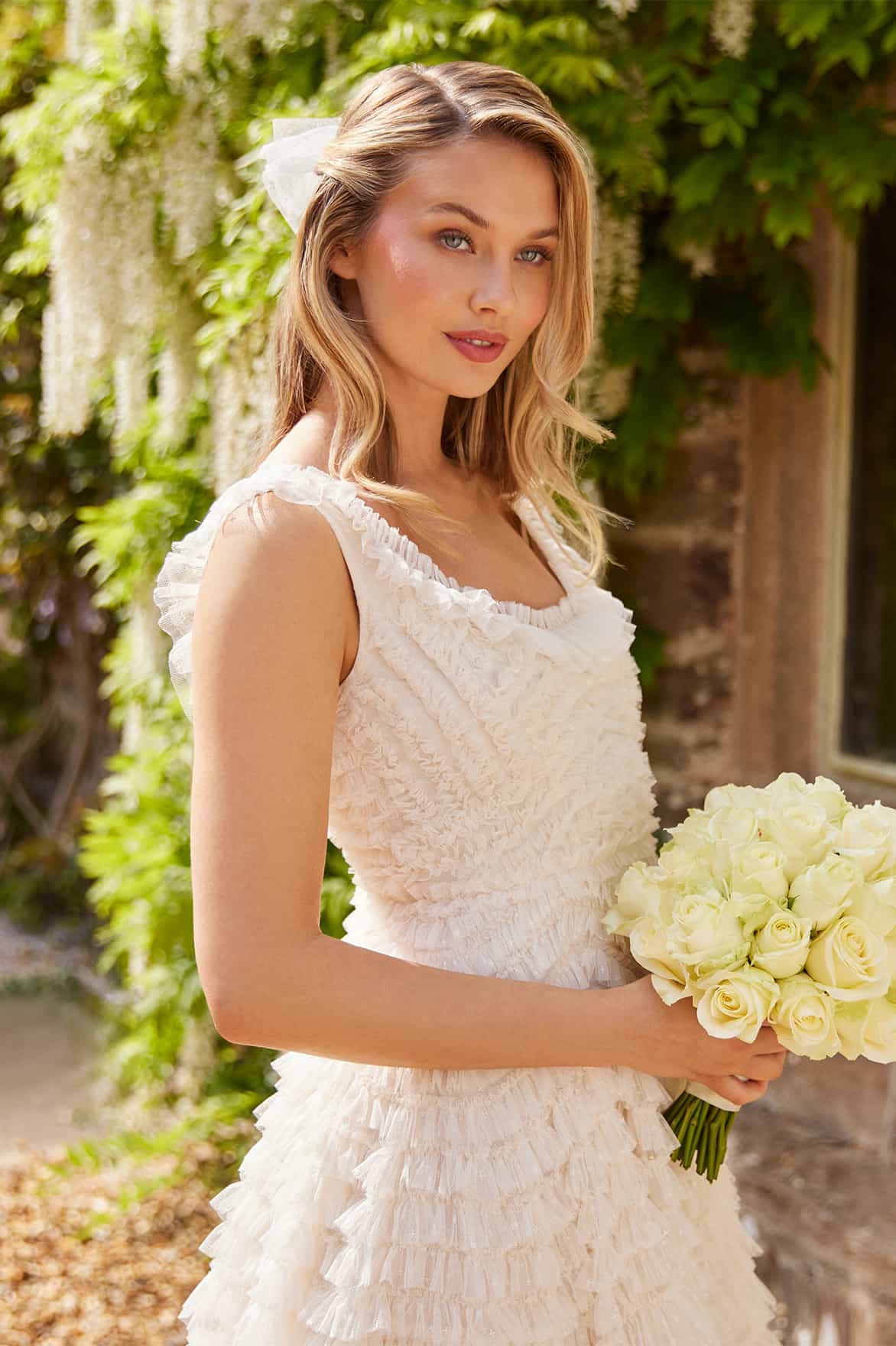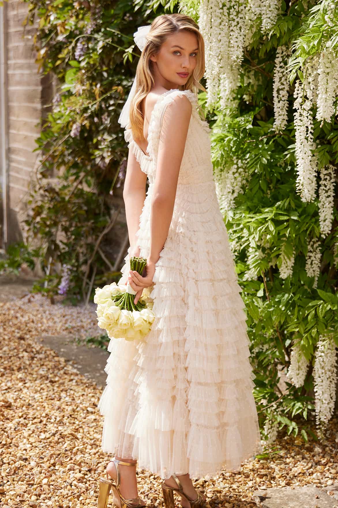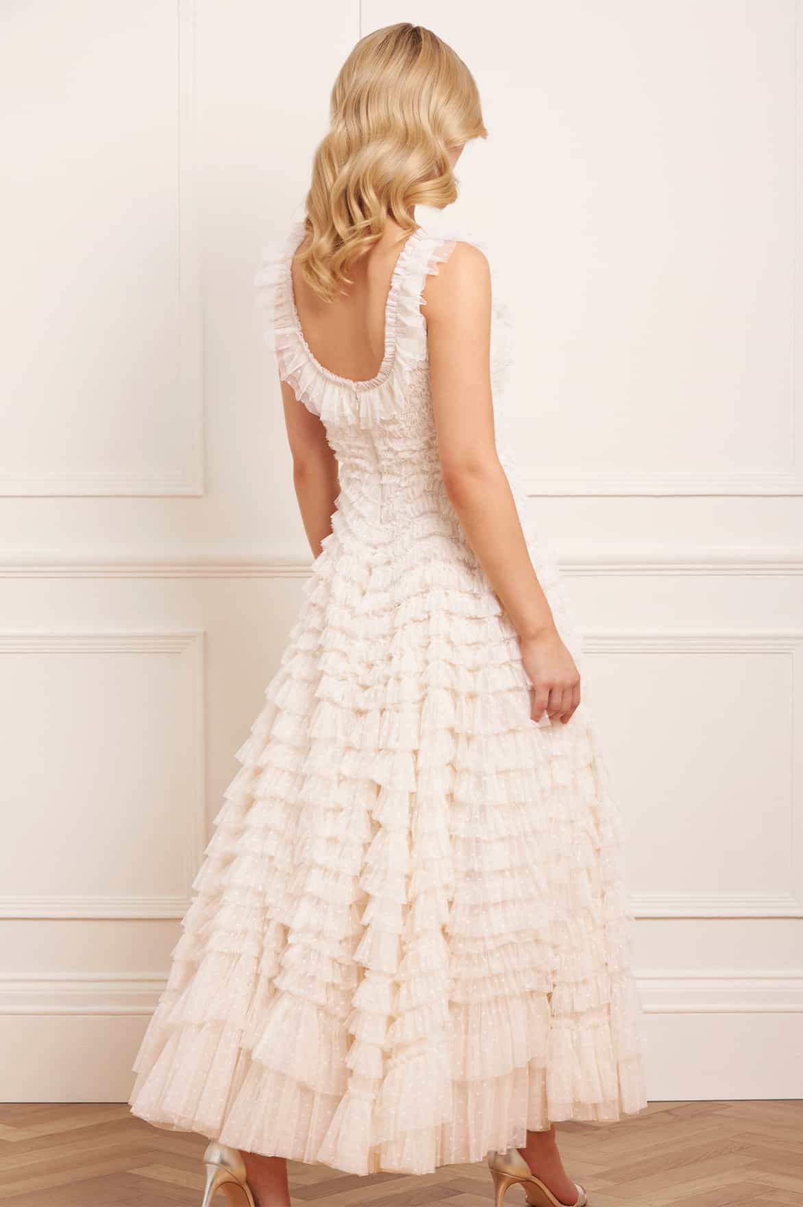 The Hattie Scoop Neck Ankle Gown in Cream. This enchanting gown showcases Needle & Thread’s signature tulle frills, artfully placed in wavy, graduated layers that cascade towards a sweeping hemline. A frill-trimmed scoop neckline adds delicate charm, while the voluminous skirt, crafted from layers of net and tulle, moves with ethereal grace. A timeless piece for the most special occasions.