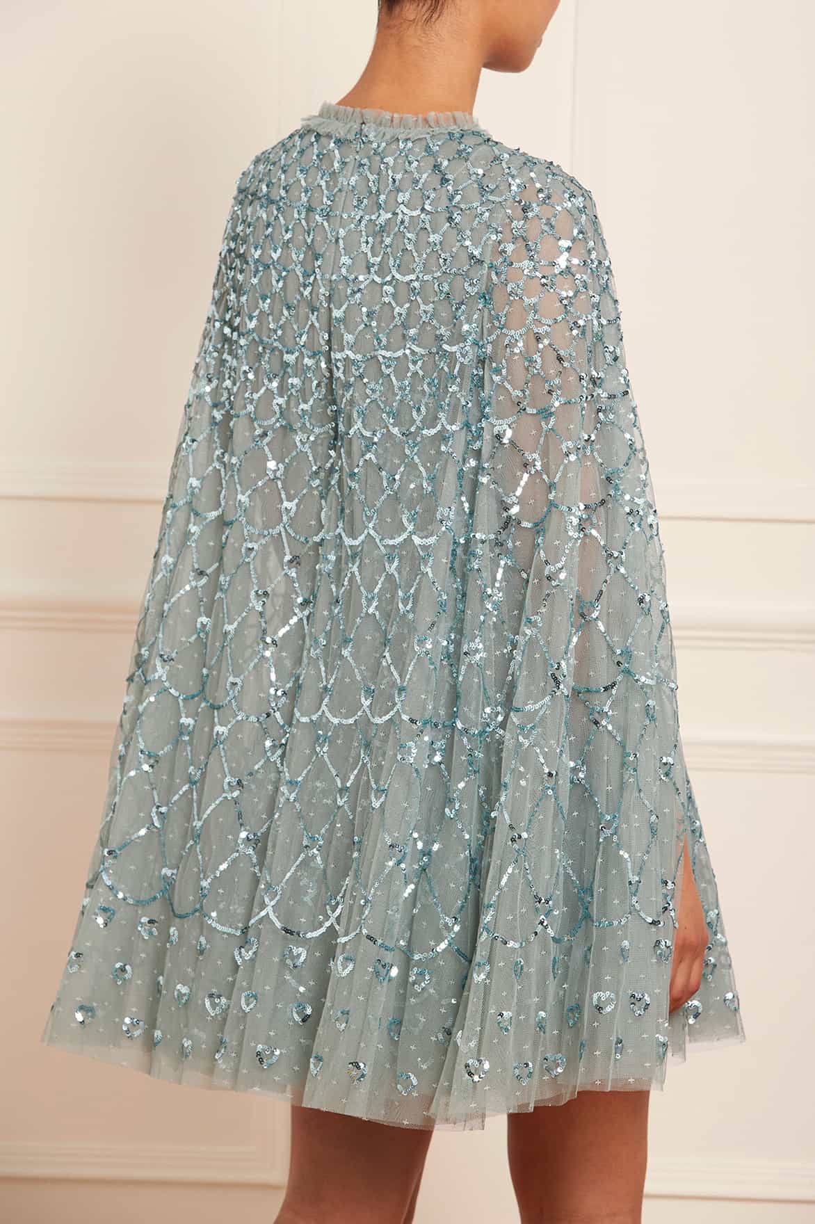 The Heart Lattice Micro Mini Dress in Sage. This dress is decorated with intricate embellishment made using the smallest sequins for exquisite detailing. Beautifully designed with heart-shaped motifs in a lattice layout. This dress features a cape for romantic detailing and a statement look. Make an entrance at your next event.