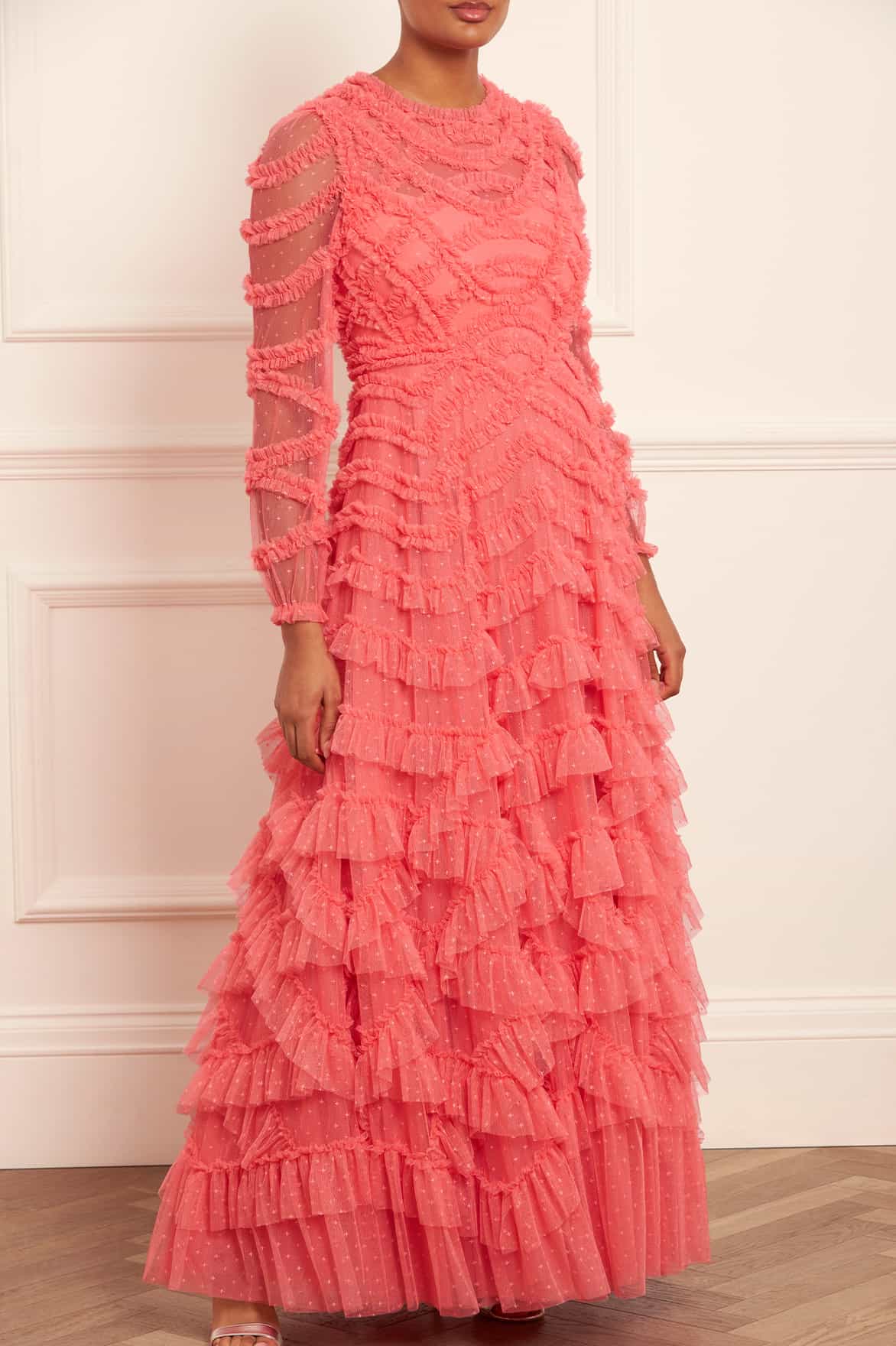 The Lana Round Neck Gown in Pink Sky. This beautiful gown is adorned and engineered with tulle frills to create a romantic textile. Developed with a round neck design and long sleeve for an elegant look. Beautifully crafted with layers of soft tulle for a whimsical, statement texture. Expect all eyes on you in this magical Needle & Thread piece.