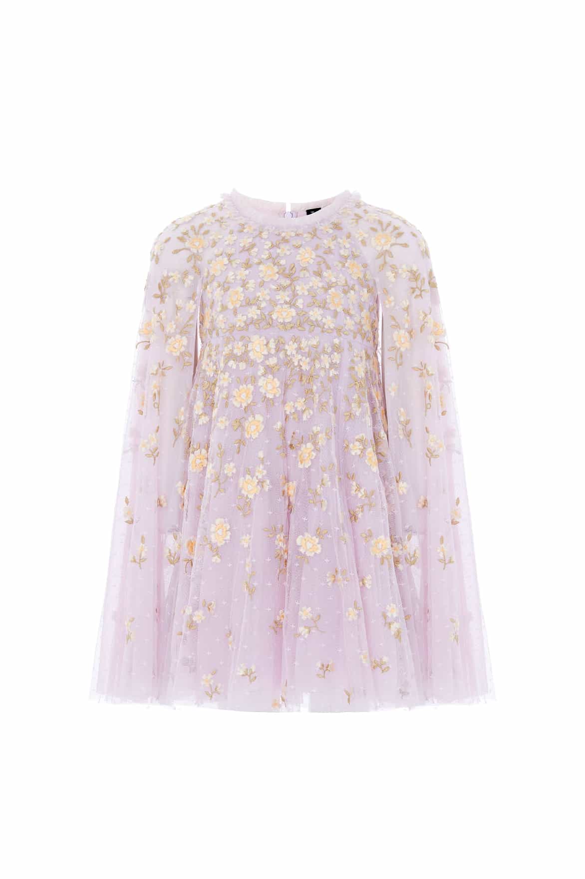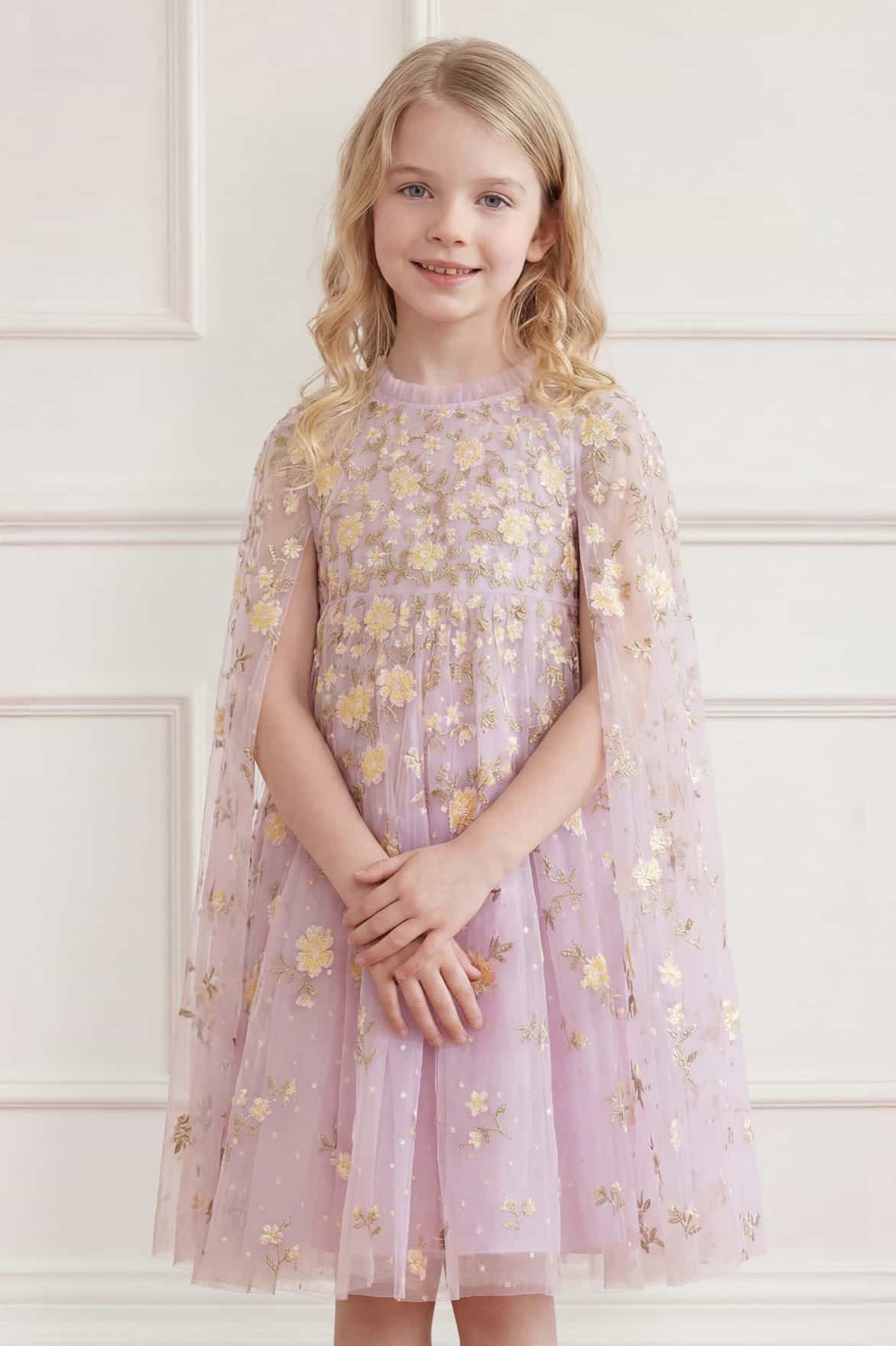 NEW SEASON. The Lea Ditsy Cape Kids Dress in Powder Lilac/Lemon Sorbet. Designed with a relaxed silhouette, this dress features a softly draped cape detail and a full skirt for graceful movement. Inspired by romantic English gardens, it feels magical yet effortless. A charming counterpart to the Lea Ditsy designs within the women’s collection.