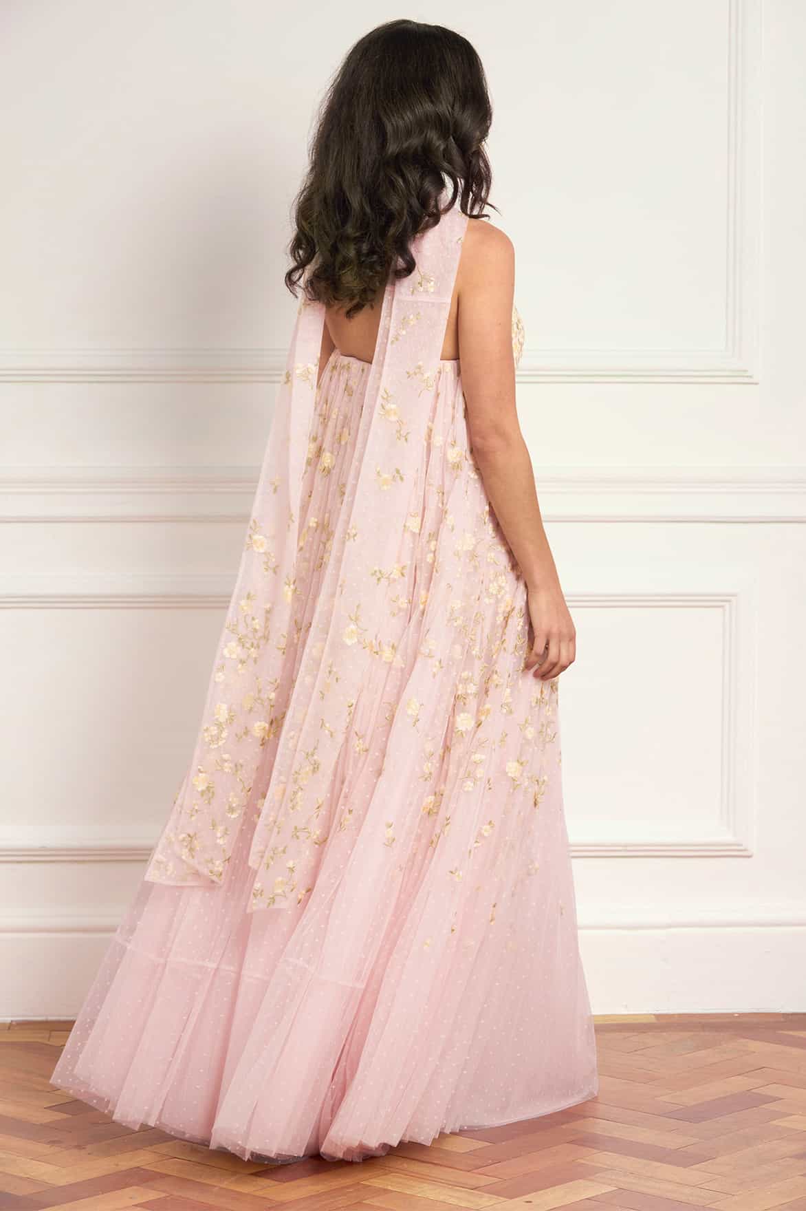 NEW SEASON. The Lea Ditsy Strapless Cape Gown in Peony Pink/Lemon Sorbet. This elegant gown features delicate ditsy florals arranged across a strapless cape silhouette, inspired by antique botanical paintings. Finished with a separate scarf and flowing skirt for a romantic statement finish.