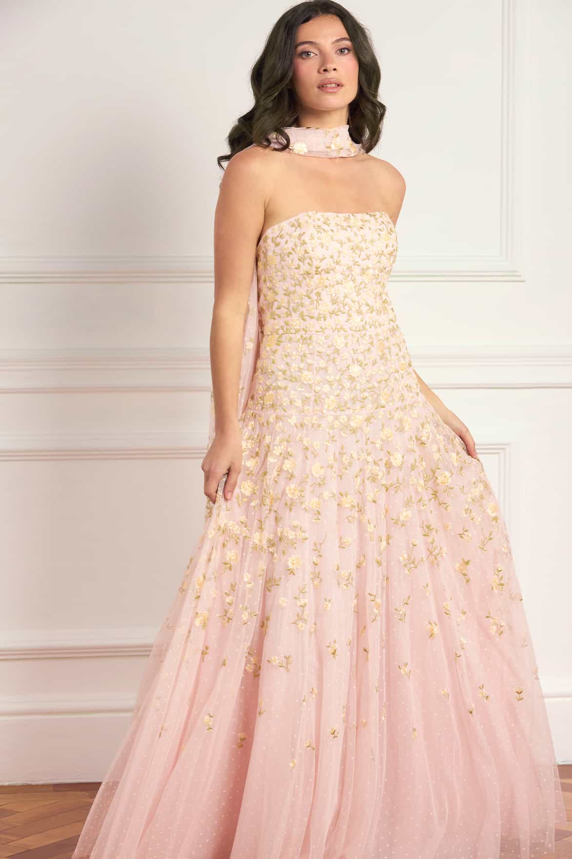 NEW SEASON. The Lea Ditsy Strapless Cape Gown in Peony Pink/Lemon Sorbet. This elegant gown features delicate ditsy florals arranged across a strapless cape silhouette, inspired by antique botanical paintings. Finished with a separate scarf and flowing skirt for a romantic statement finish.