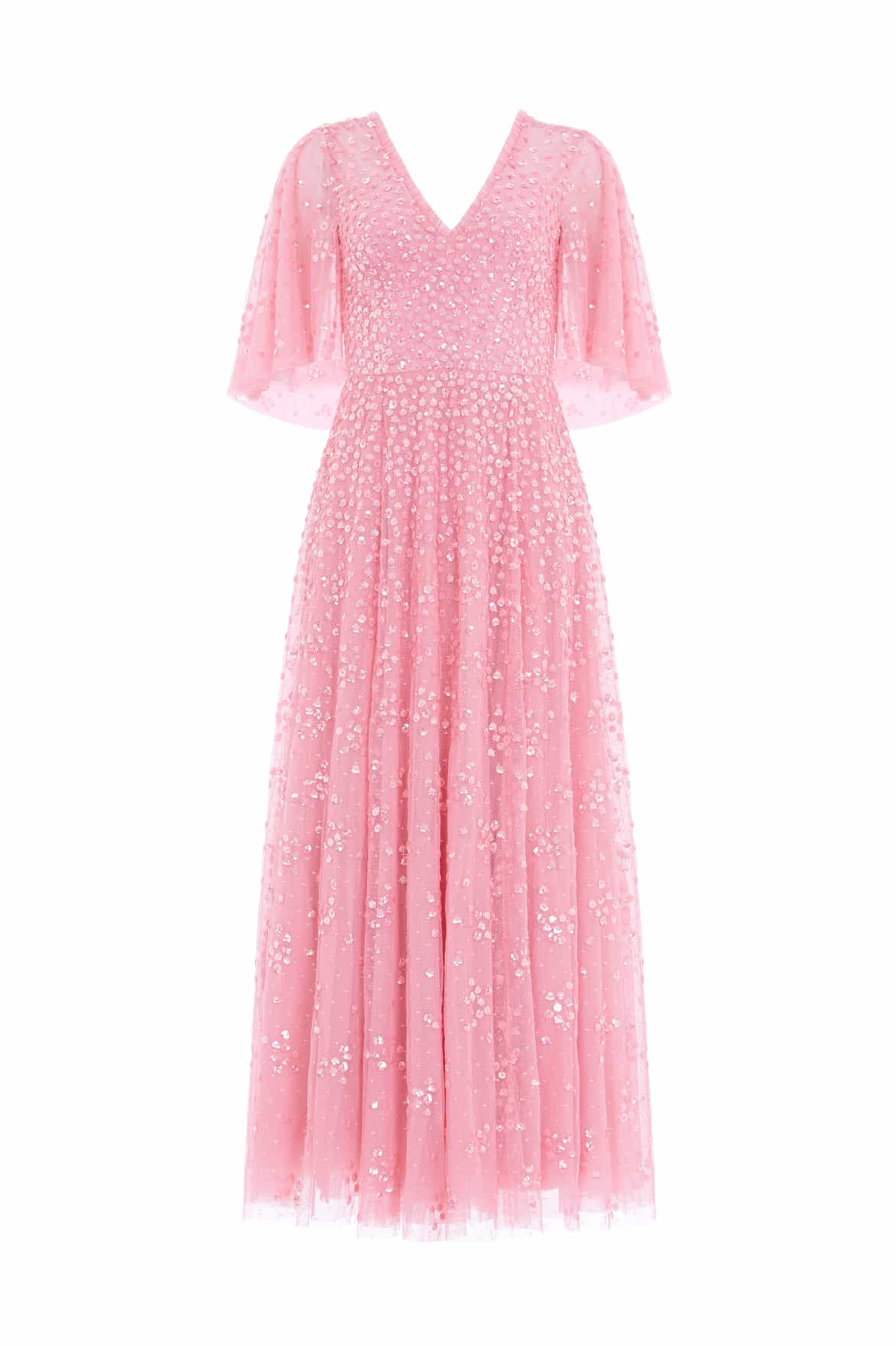 The Leila Dot V-Neck Cape Ankle Gown in Primrose is embellished with shimmering clustered dot motifs for a sparkling effect. This elegant V-neck gown features slim sleeves and signature Needle & Thread tulle frills at the neckline and armholes. The skirt, crafted from layers of net and tulle, finishes with a sweeping hemline. A captivating design.
