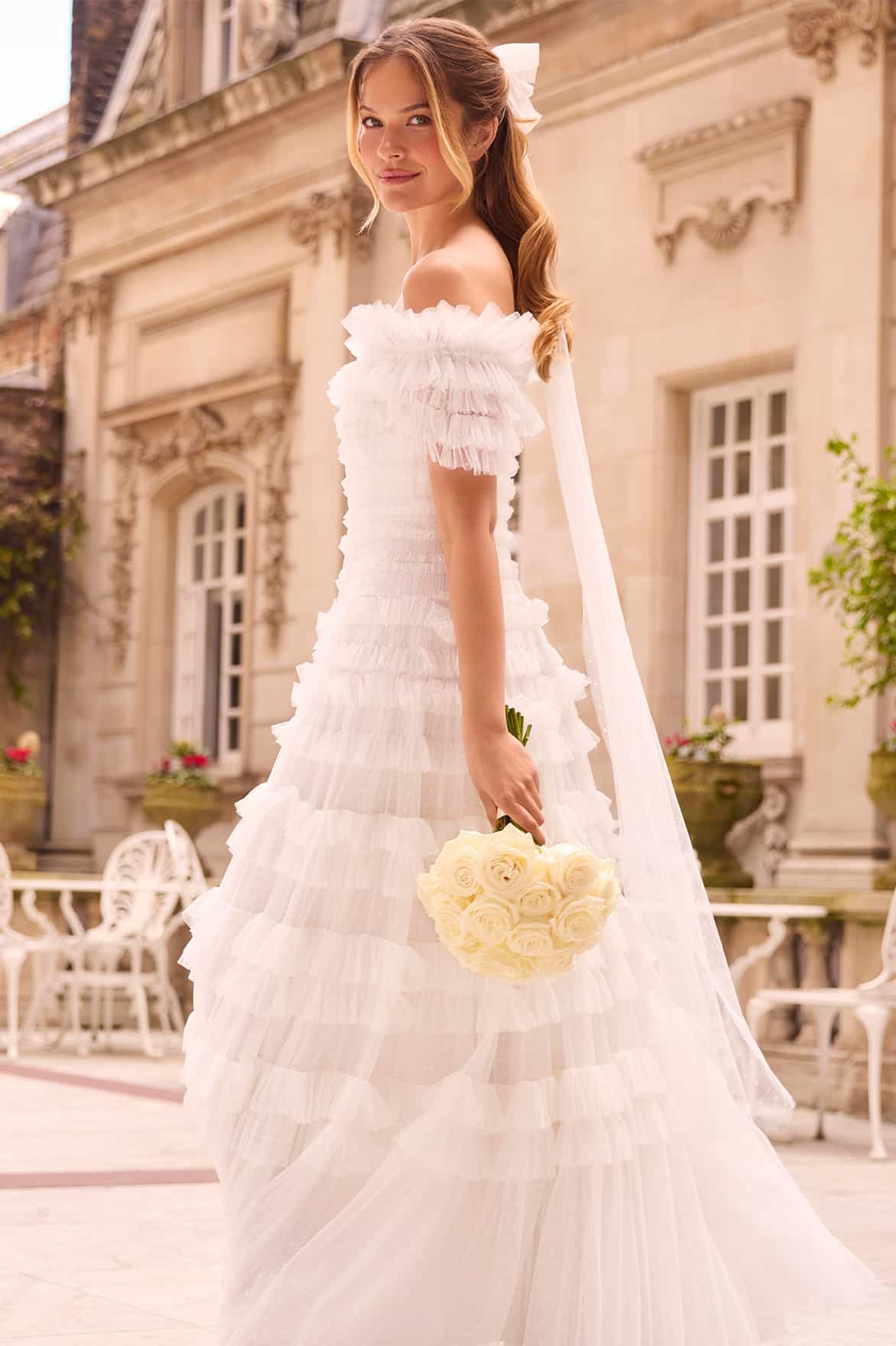 NEW SEASON | NEEDLE & THREAD EXCLUSIVE. The Lisette Ruffle Off-Shoulder Gown in Swan White. A statement off-shoulder gown adorned with cascading ruffles that enhance the silhouette with graceful movement. The softly structured bodice flows into a fluid skirt for timeless elegance.