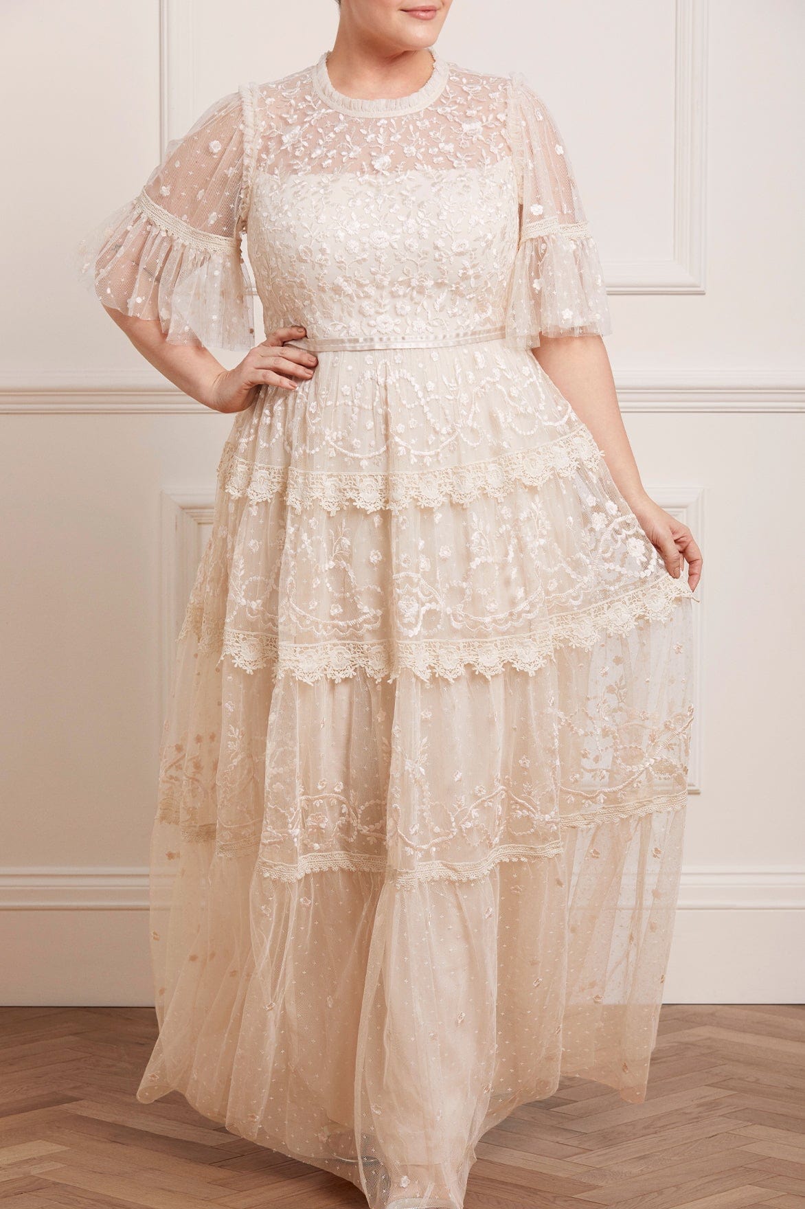 The Midsummer Lace Round Neck Gown in Champagne. A signature Needle & Thread style, with an updated neckline for the Taking inspiration from Victorian lace, the Midsummer features intricately embroidered artwork in tonal colours on delicate tulle. Beautifully developed with lace frills framing each tier of the skirt. This embroidered lace gown has sheer, romantic sleeves and our signature grosgrain ribbon at the waist. The perfect gown to take you from day to night.