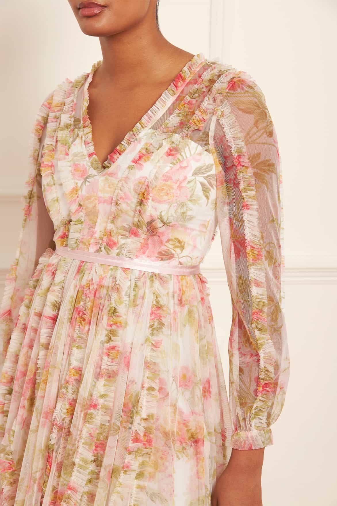 Peony. Promise V-Neck Gown in Moonshine. This gown is printed beautifully with hand-painted sunset pink peonies.. Beautifully created in our soft, delicate tulle fabric for a romantic look. Developed with gently gathered frills, stitched vertically throughout this style to create an ethereal texture to this signature Needle & Thread style. A style you'll wear time and time again.