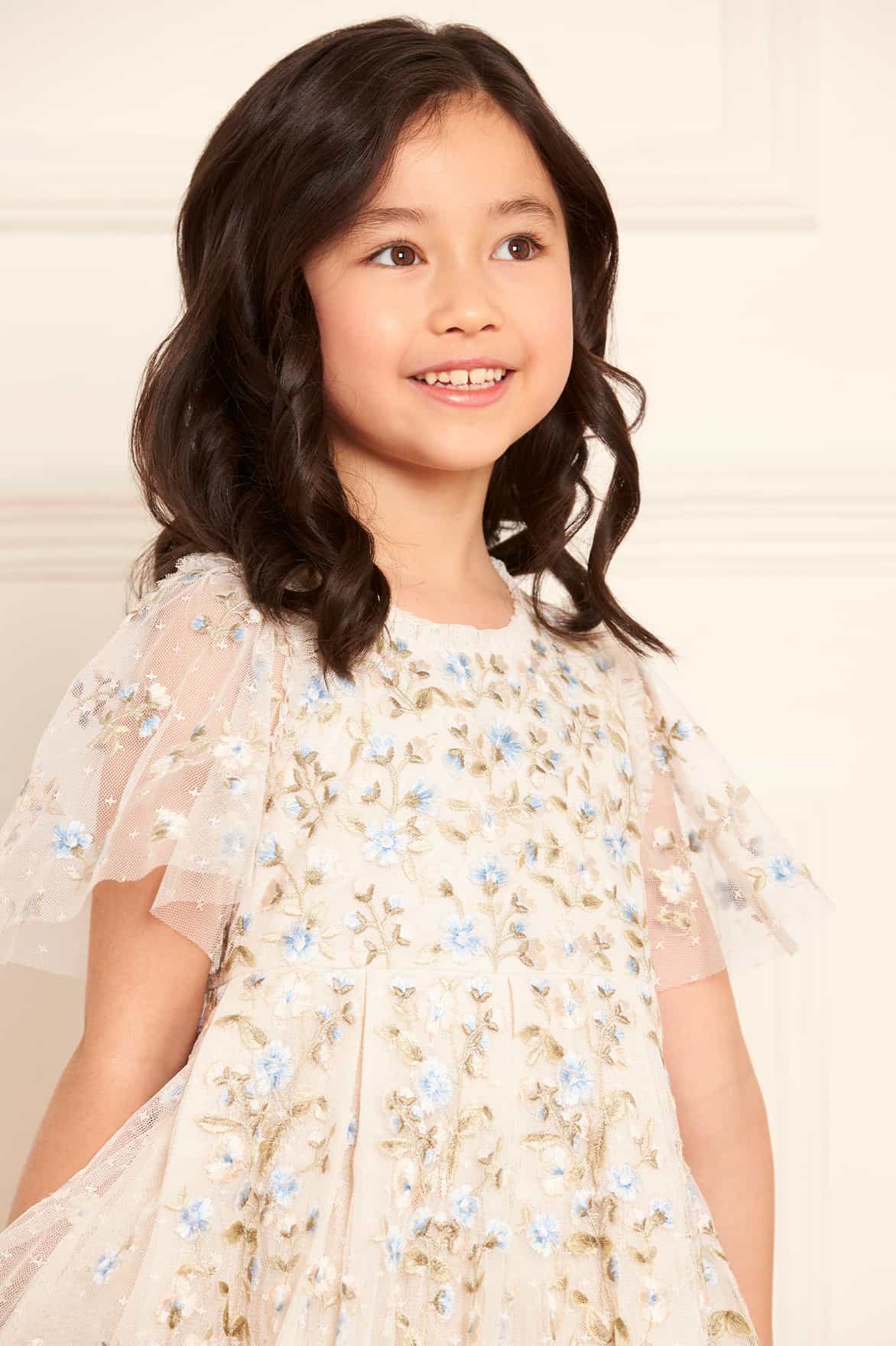 The Posy Pirouette KIDS Prom Dress in Cream / Blue. A brand new statement style for this season. Beautifully designed with intricate, rich embroidered artwork inspired by our ‘summer posy’ print. Developed with posy florals scattered all over and dispersing towards the hem, creating a pretty embroidery design. The skirt is made from generous layers of net and tulle, creating a sweeping hemline. The perfect dress for all their upcoming special events.