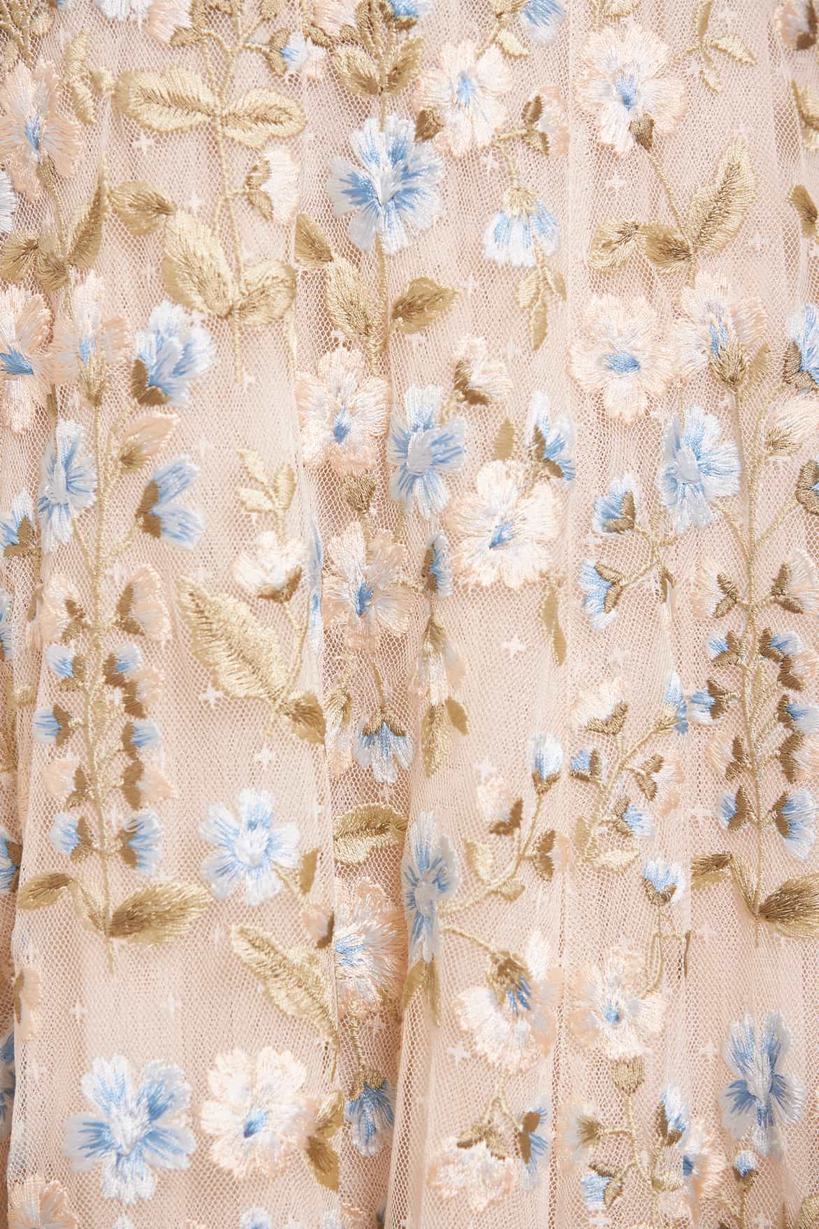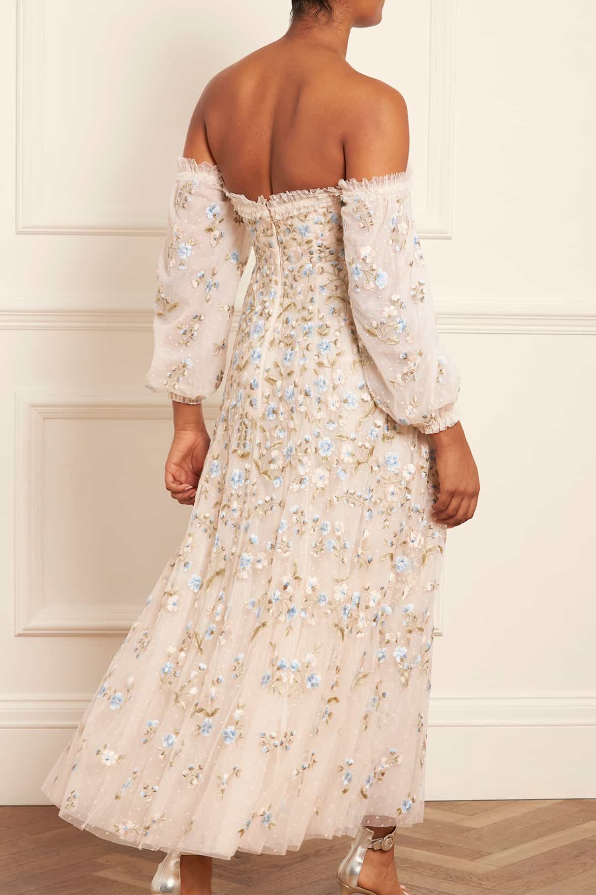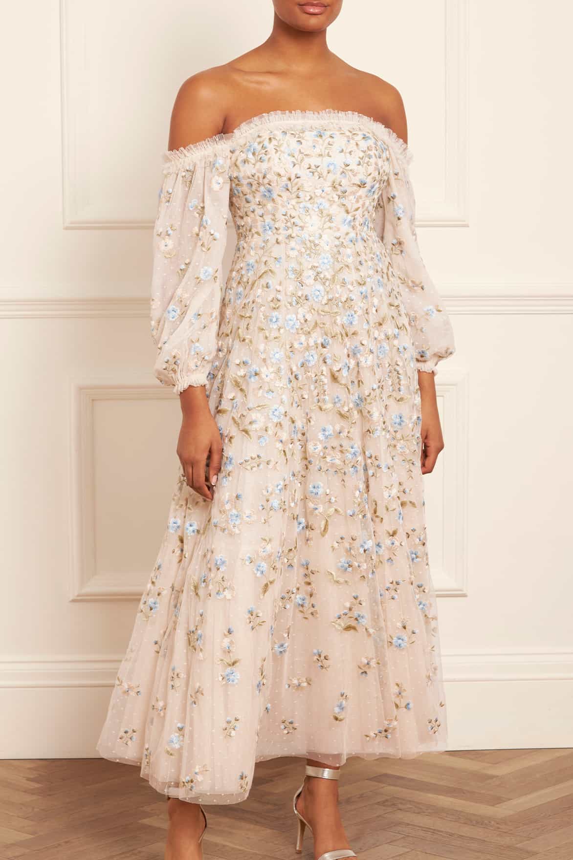 The Posy Pirouette Off-Shoulder Ankle Gown in Cream / Blue. A statement style for the season ahead. This gown is beautifully embroidered with intricate, rich posy florals scattered all-over and dispersing towards the hem. Developed with an off-the-shoulder design and adorned with soft, tulle ruffles adding a romantic finish. The sleeves are crafted using layers of tulle net for a more structured look. Crafted with a net tulle generous skirt with a sweeping hemline. A traditional yet stylish gown.