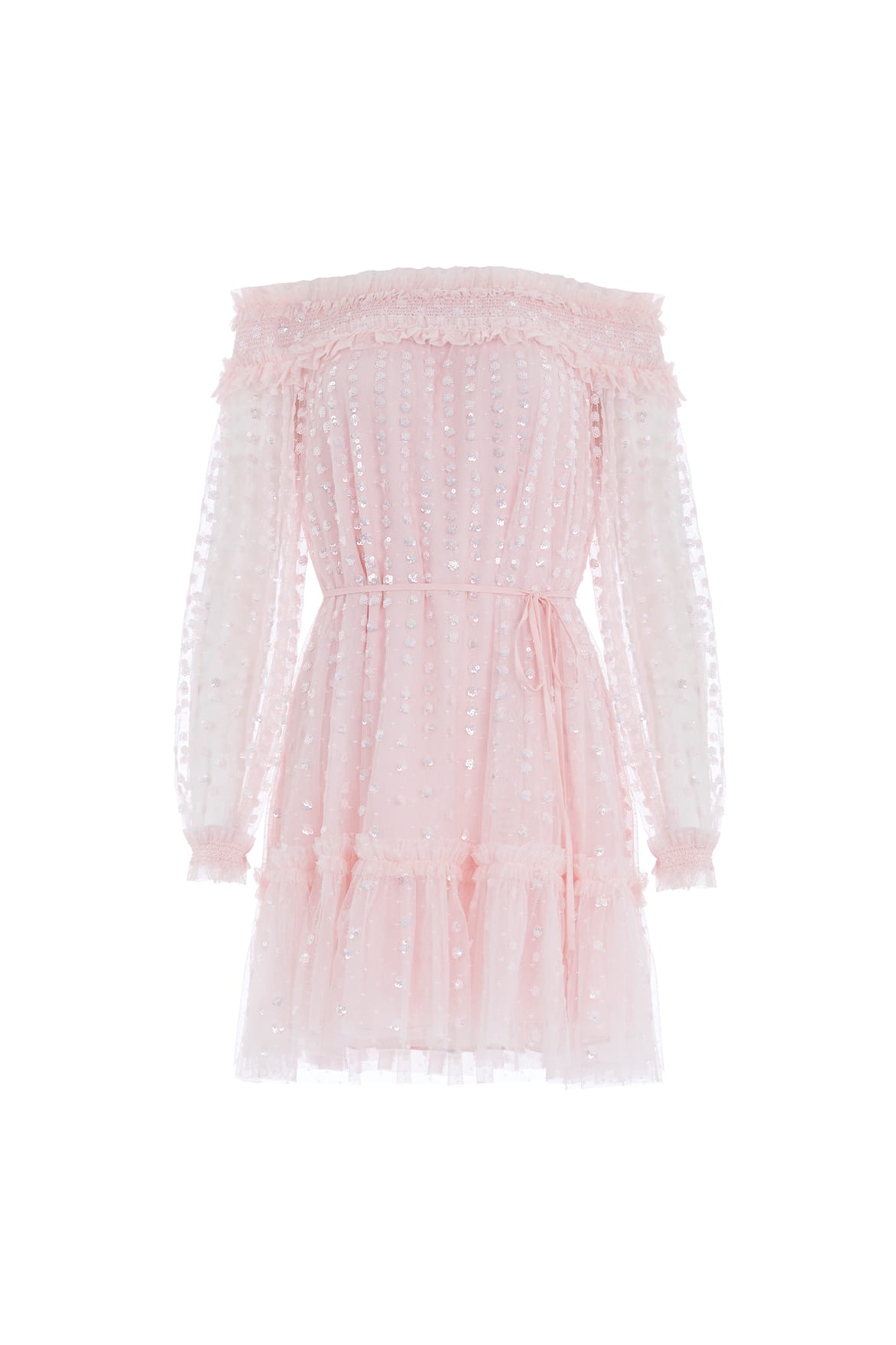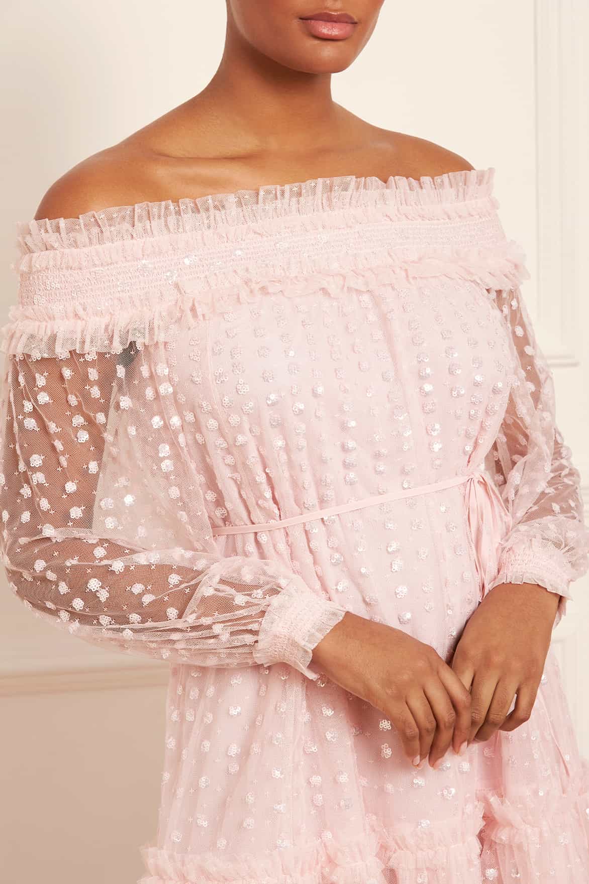 The Raindrop Smocked Gloss Off-Shoulder Micro Mini Dress in Peony Pink. Beautifully decorated with shimmering sequins dispersing down the body. This dress is developed with an off-the-shoulder design with signature Needle & Thread frills for an elegant look. This romantic style is crafted with a loose-fit, whimsical silhouette featuring a delicate fabric belt for versatile styling. A piece you'll forever treasure.