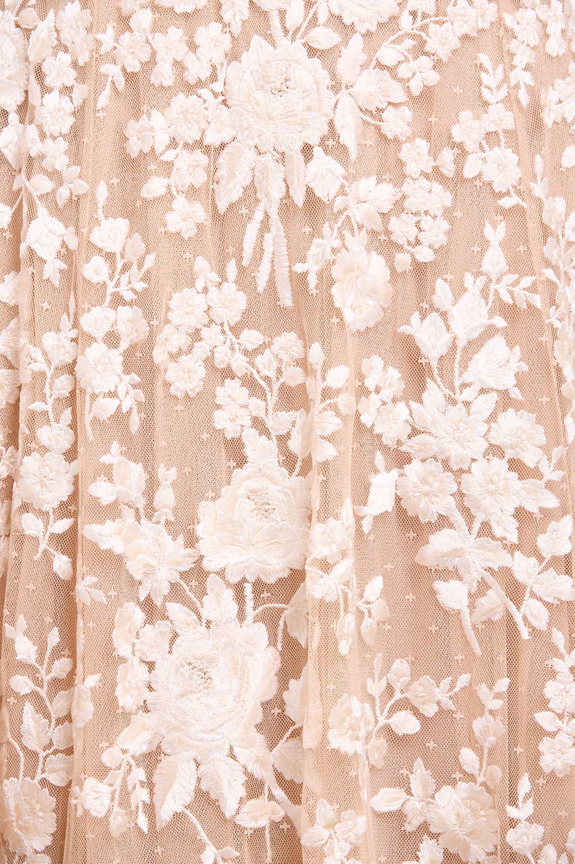 The Rosa Scoop Neck Ankle Gown in Beige/Cream. Vintage-inspired rose embroidery in soft tonal hues decorates the bodice of this dress. The floral motifs bloom from the centre and trail down the skirt into delicate ditsy clusters. With a flattering scoop neckline and flowing silhouette, this gown is ideal for romantic occasions and evening elegance. Complete the look with a drama flair by adding the Rosa Hooded Cape.