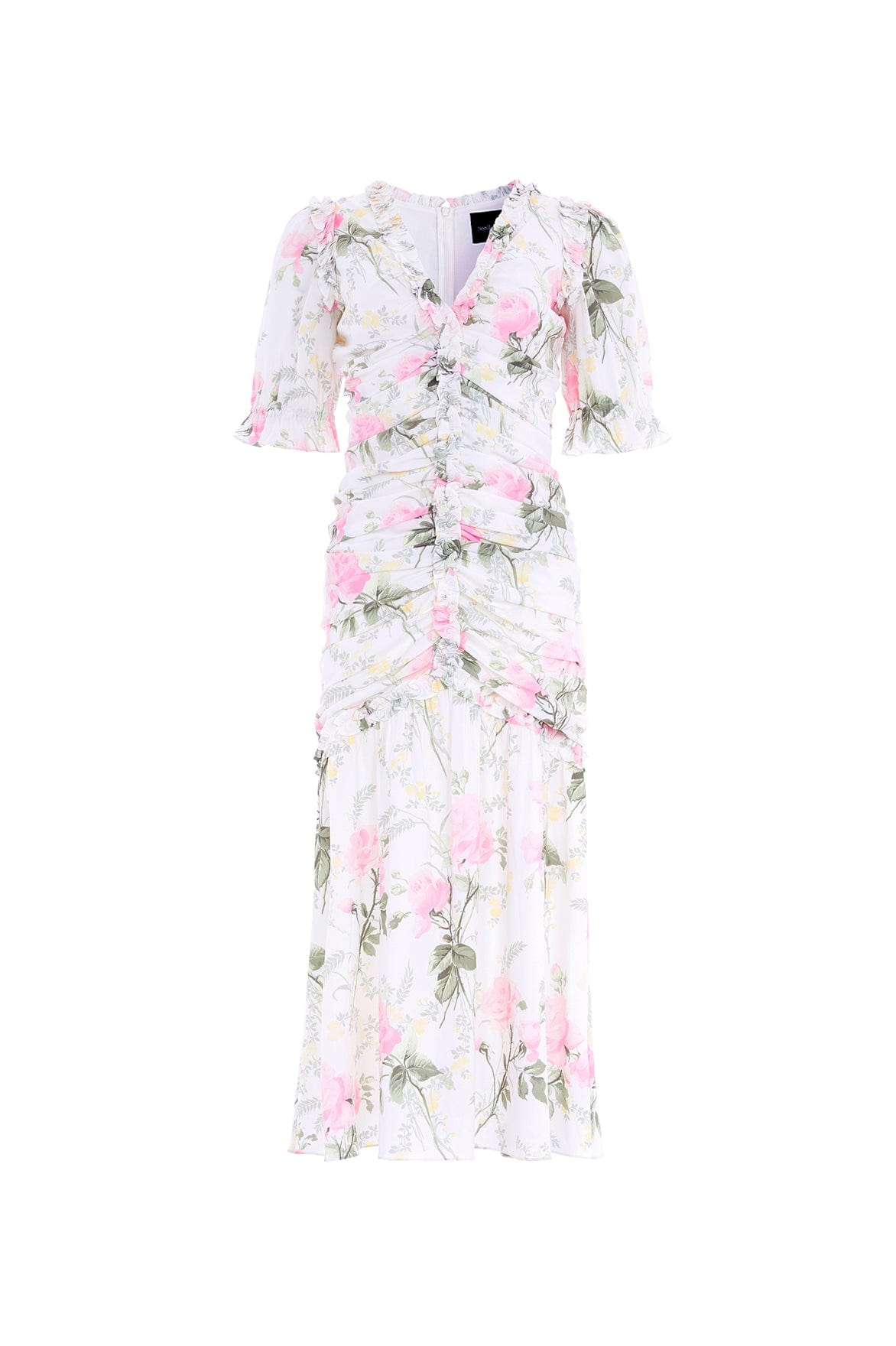 The Rose Ellen Crepe Short Sleeve Ballerina Dress in Moonshine/Pink features a romantic print inspired by antique hand-painted artwork with large rose blooms and trailing florals. Crafted from stretch crepe, this dress offers a flattering fit with a gathered bodice, slim sleeves, and a ruffled hem tier. The V neckline is adorned with signature frills for an elegant touch. A timeless, stylish piece to treasure.