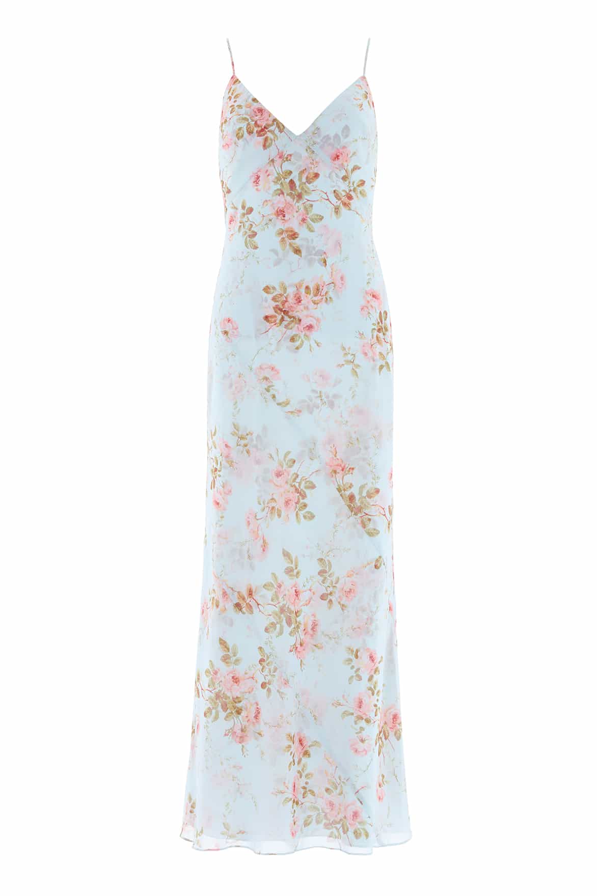 NEW SEASON | NEEDLE & THREAD EXCLUSIVE. The Summer’s Rose Georgette Cami Gown in Aqua. Featuring the exquisite Summer’s Rose print inspired by archival trailing florals, this cami gown is crafted in fluid georgette. Cut on the bias for a smooth, body-skimming fit and effortless wear, the silhouette moves beautifully from bodice to hem.