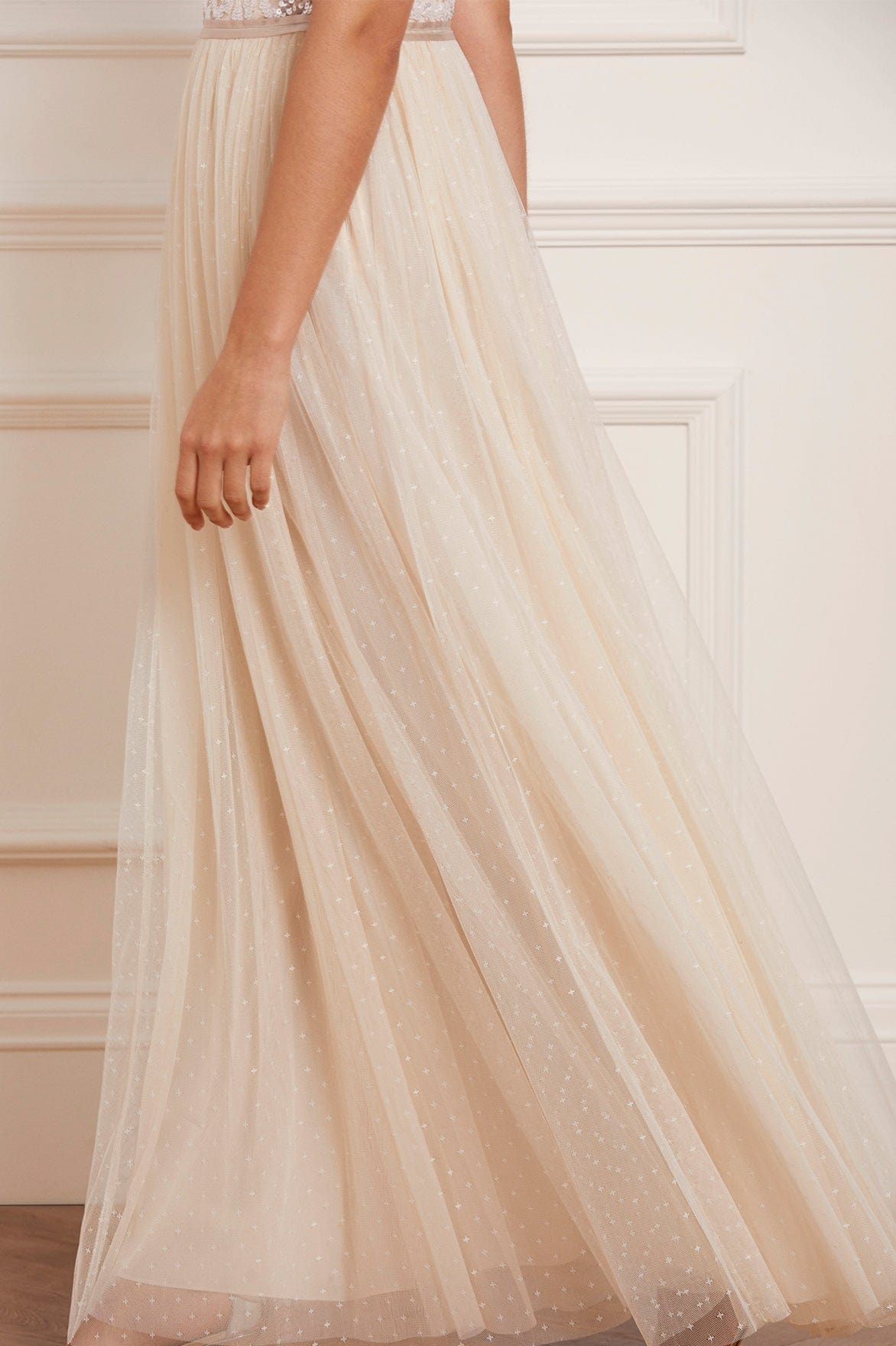 The Tempest Strapless Corset Bodice Gown in Champagne/Pink. The bodice of this gown is embellished with shimmering, iridescent sequins in romantic floral lace motifs. Designed with an integrated corset made with ribbon stitching, soft boning and panels of stretch mesh fabric for comfort and security in the fit. Crafted with layers of signature kisses tulle creating romantic movement as you walk. A true fairytale piece in the collection.