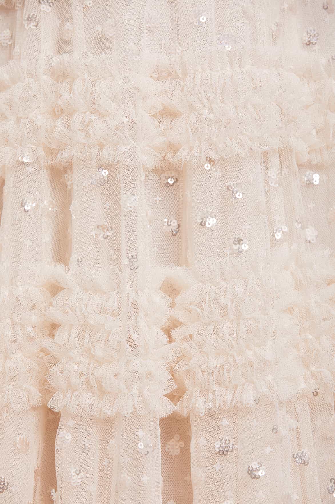 The Vivian V-Neck Gown in Cream. A signature Needle & Thread style statement. Beautifully printed with sequin polka dot motifs scattered throughout, creating an enchanting shimmer. Adorned with specially sourced sequins to create a sparkling effect throughout. This romantic style features tulle frills in perfectly positioned rows, creating a soft, frothy texture. Developed with generous ruffled sleeves and a V-neckline for a contemporary look. A style you'll wear time and time again.