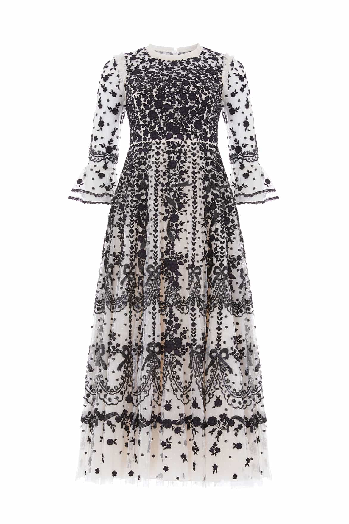 The Adeline Round Neck Ankle Gown in Cream/Graphite. This beautiful dress combines refined craftsmanship with striking detail. The round neckline offers a demure balance to the richly embellished bodice, adorned with lace-inspired embroidery, miniature bows and cascading florals. Scalloped borders flow seamlessly into the ankle-length hem, designed to flatter and flow with every movement. A standout look for refined events dressing.