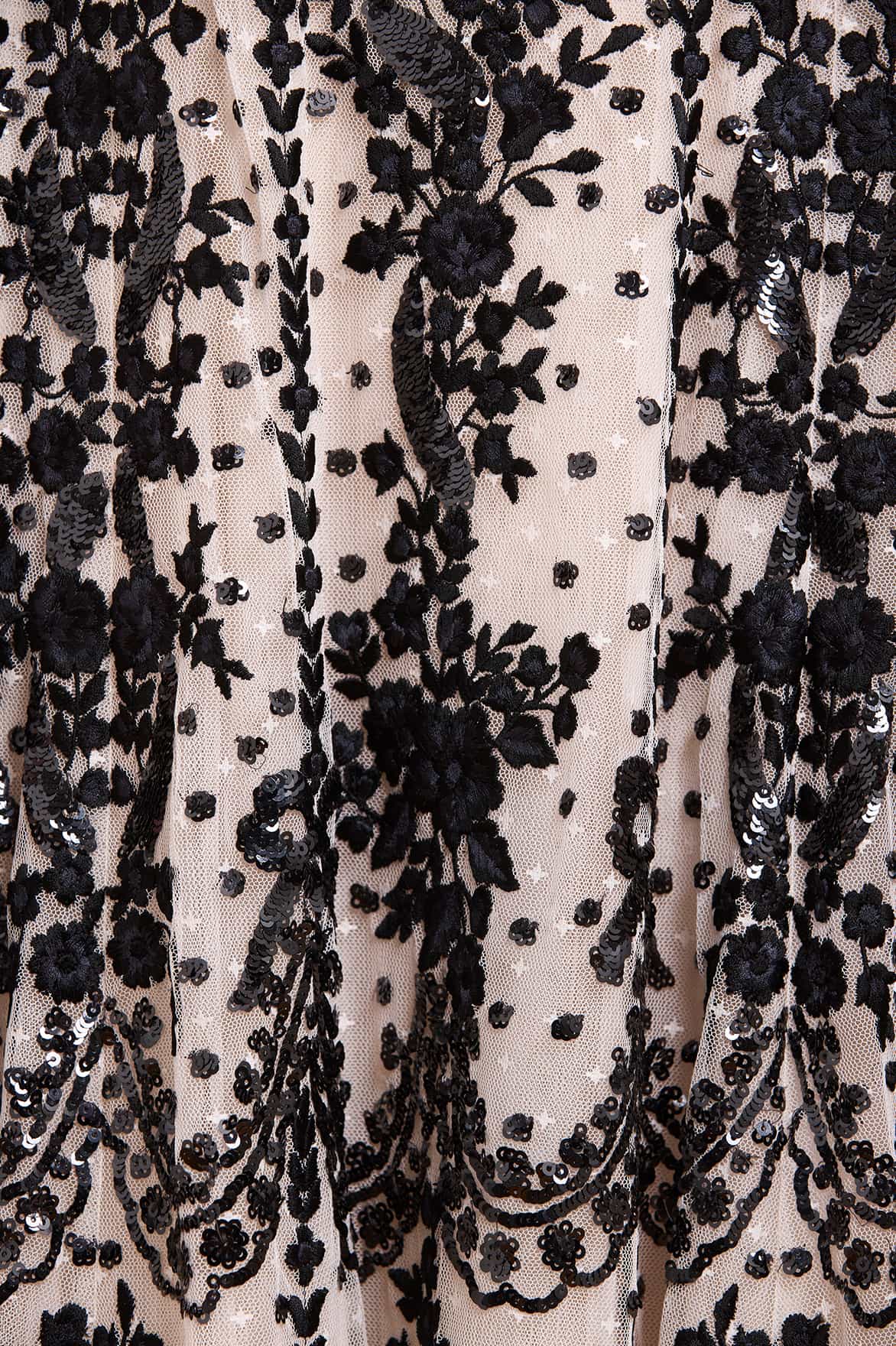 - Kisses tulle decorated with sequins and floral embroidery