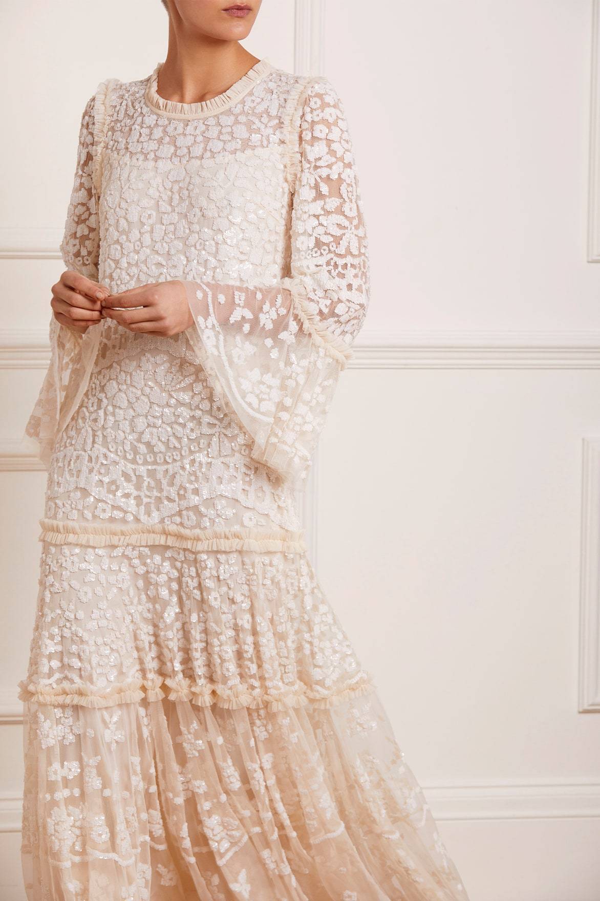 The Annie Sequin Tiered Ankle Gown in Champagne. Adorned with shimmering sequins in a floral and bow artwork, this gown is inspired by a lace tablecloth. Designed with a loose fit silhouette and tiered throughout, creating beautiful movement. Make an effortless statement.
