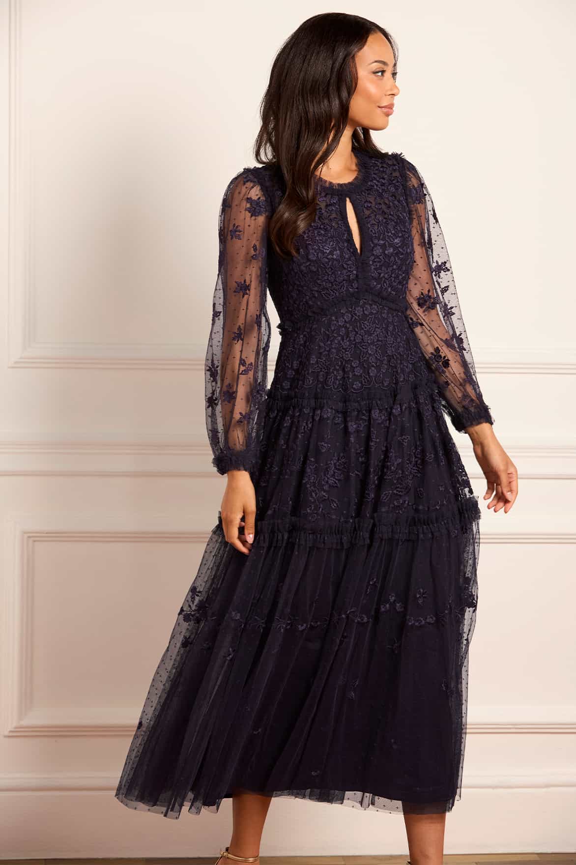 The Autumn Lace Long Sleeve Ankle Gown in Midnight/Blue. This signature Needle & Thread style is designed with floral motif embroidery inspired by antique lace designs. This gown is developed with romantic sheer long sleeves, and a gathered tiered hem, and is created from layers of soft tulle to create a flattering silhouette. A classic and contemporary style.