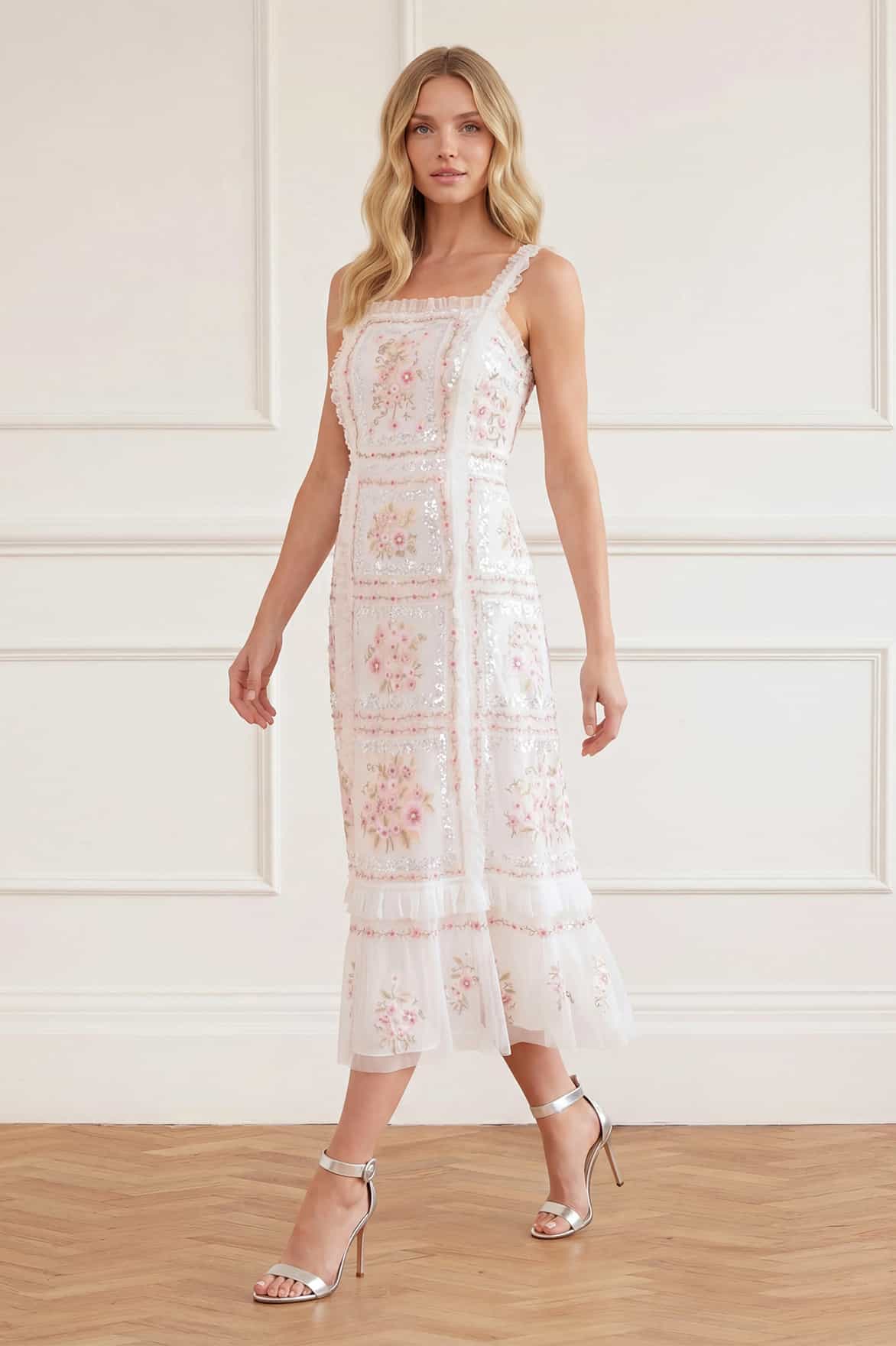 NEW SEASON. The Blossom Bib Ballerina Dress in Swan White/Multi. Inspired by the final blooms of summer, this romantic ballerina dress features delicate floral detailing set against a softly structured bib bodice. The full, flowing skirt creates elegant movement and a beautifully balanced silhouette. A timeless choice for luxury occasion wear and summer celebrations.