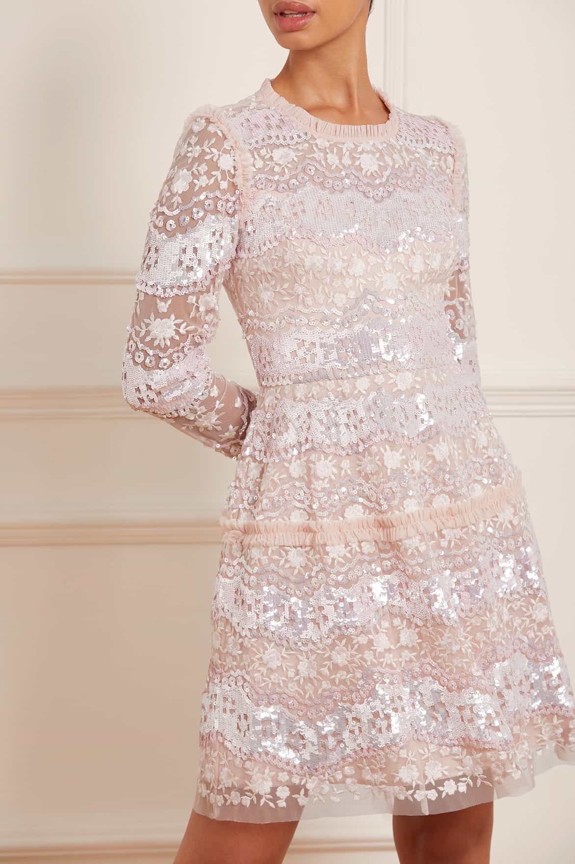 The Chantilly Sequin Micro Mini Dress in Petal Pink. A signature silhouette for Needle & Thread, featuring double layers of net to hold this elegant shape for the most flattering look. The artwork is inspired by 1930s styling, featuring floral embroidery in rich tonal shades and high impact sequin stripes. Make time to shine in the Chantilly