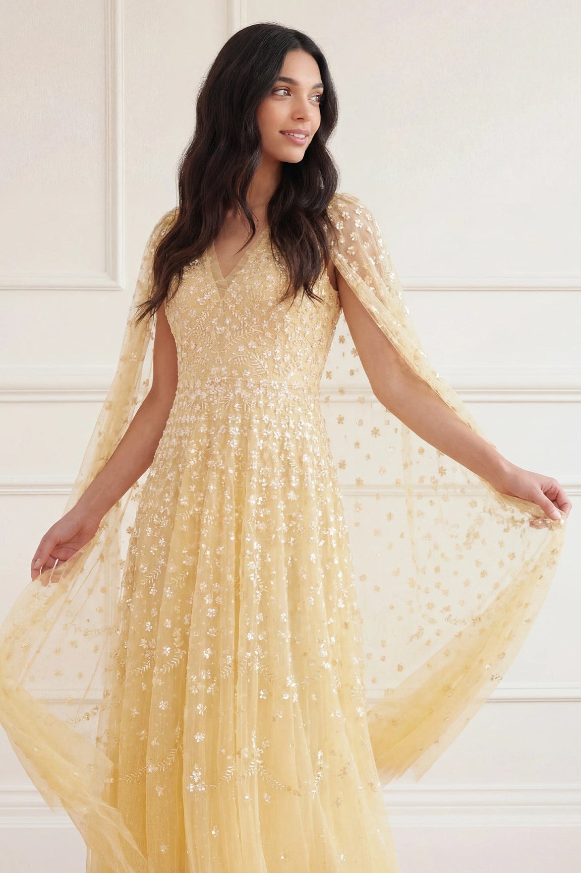 NEW SEASON. The Clover Cape Sleeve Ankle Gown in Citron. Inspired by romantic garden blooms, this ankle-length gown features soft cape sleeves that drape elegantly over the arms. Finished with a flowing silhouette for graceful movement and refined occasionwear styling.
