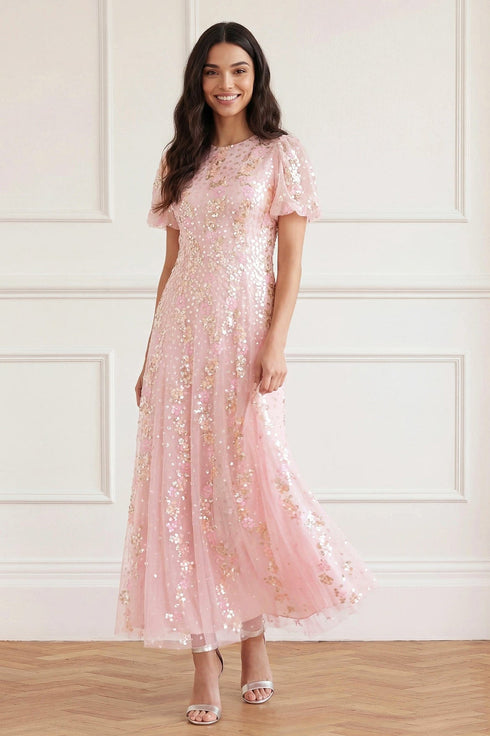 NEW SEASON. The Confetti Round Neck Ankle Gown in Peony Pink/Multi. Inspired by garden blooms in motion, this gown is adorned with scattered floral sequins that shimmer beautifully with movement. Finished with a round neckline and elegant ankle-length silhouette for refined occasionwear.