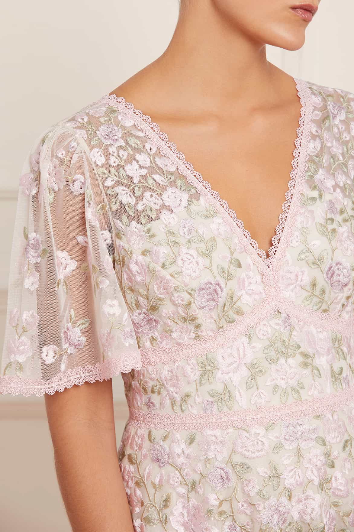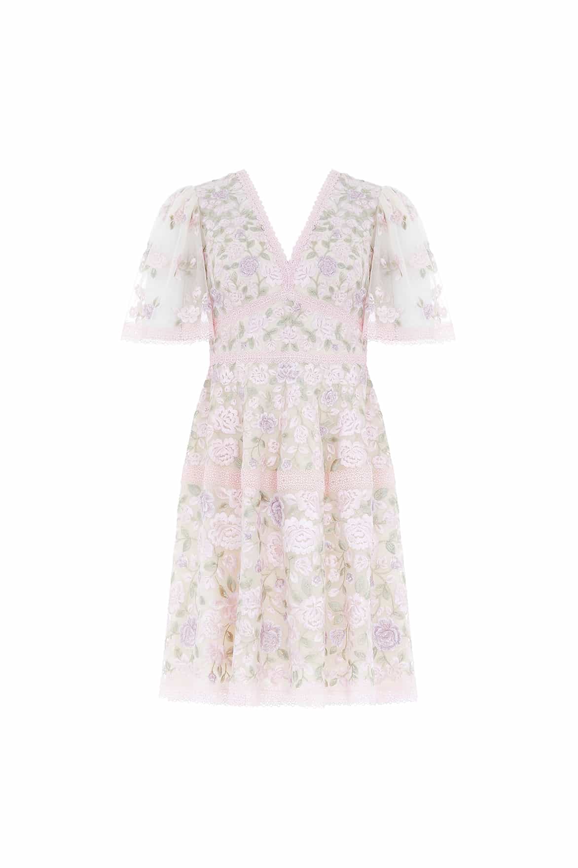 The Lavender Rose Micro Mini Dress in Champagne. This dress is beautifully crafted with romantic rose petal embroidered artwork, inspired by traditional English roses. Featuring floral motifs in soft pastel tones, a classic Needle & Thread silhouette and intricate lace trims for a premium finish. The perfect dress for any occasion.