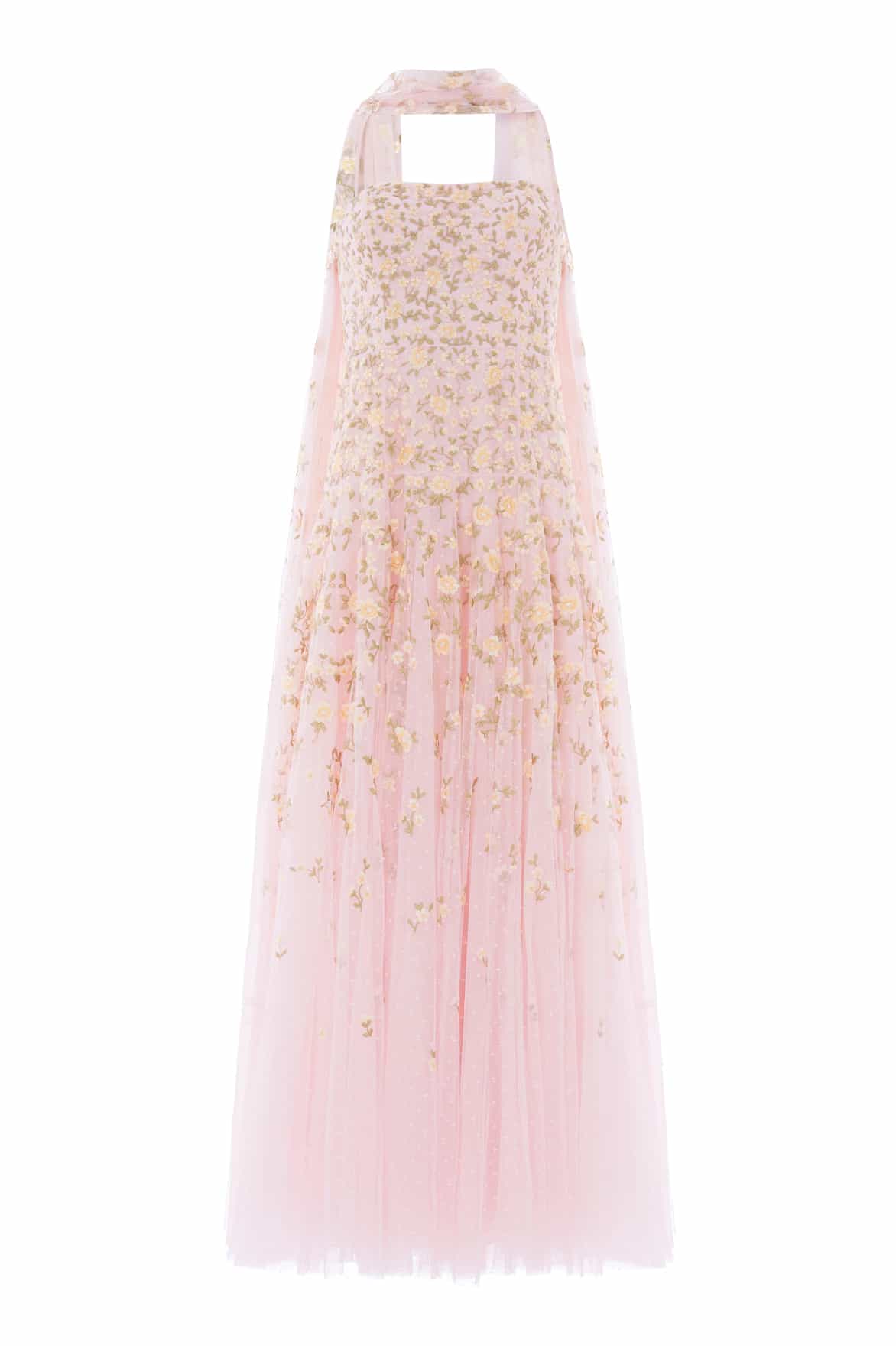 NEW SEASON. The Lea Ditsy Strapless Cape Gown in Peony Pink/Lemon Sorbet. This elegant gown features delicate ditsy florals arranged across a strapless cape silhouette, inspired by antique botanical paintings. Finished with a separate scarf and flowing skirt for a romantic statement finish.