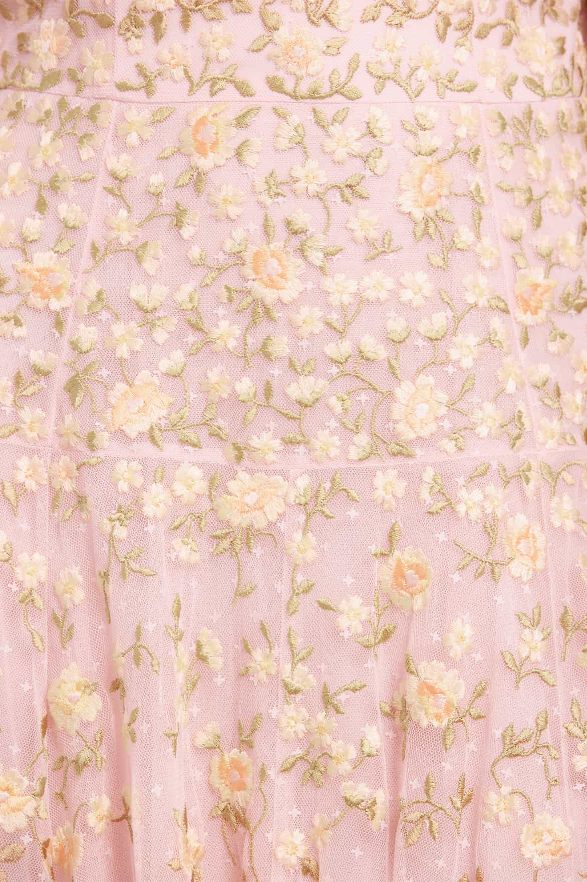 - Kisses tulle decorated with floral embroidery.