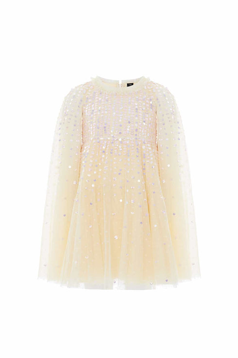 NEW SEASON. The Moonlight Sequin Cape Kids Dress in Lemon Sorbet/Pink. This enchanting kids dress is adorned with softly shimmering sequins that cascade gently across the design. The flowing cape detail and full skirt create an ethereal silhouette that moves effortlessly. Perfect for a party moment.