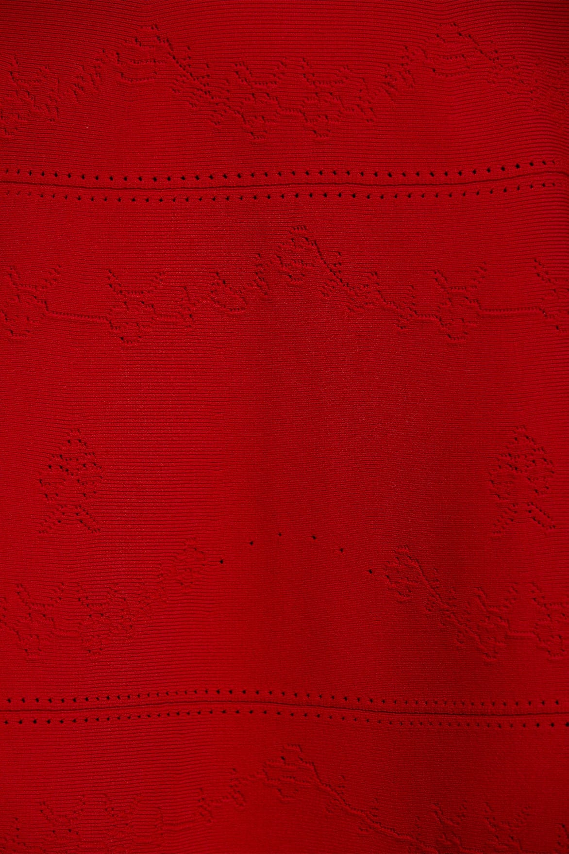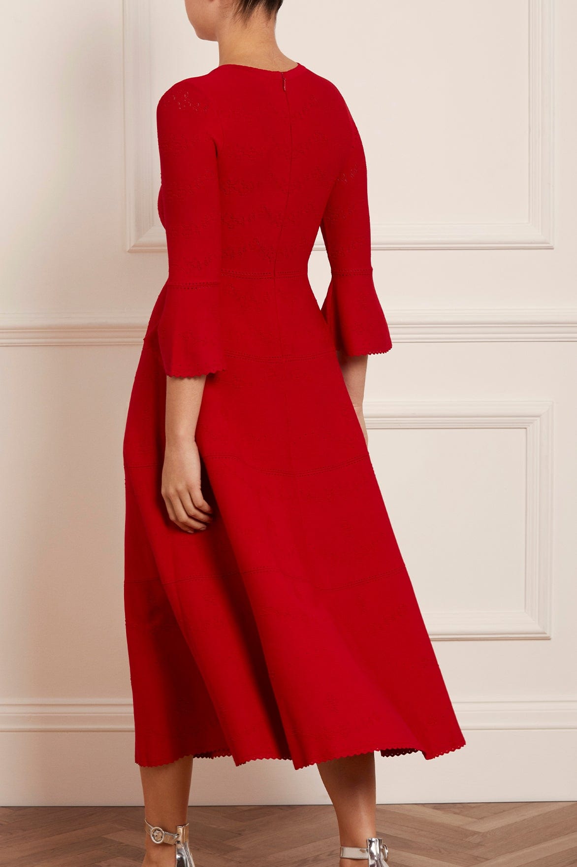 The Pretty Pointelle Knit Ankle Gown in Red. A brand new style for Needle & Thread. This knitted gown is inspired by vintage ditsy florals and lace. Beautifully designed with all-over pretty pointelle stitch, delicate florals and scallop details. This gown has a fitted stretch bodice with a soft, round neckline, fluted cuffs and signature Needle & Thread detailing. A truly flattering piece.