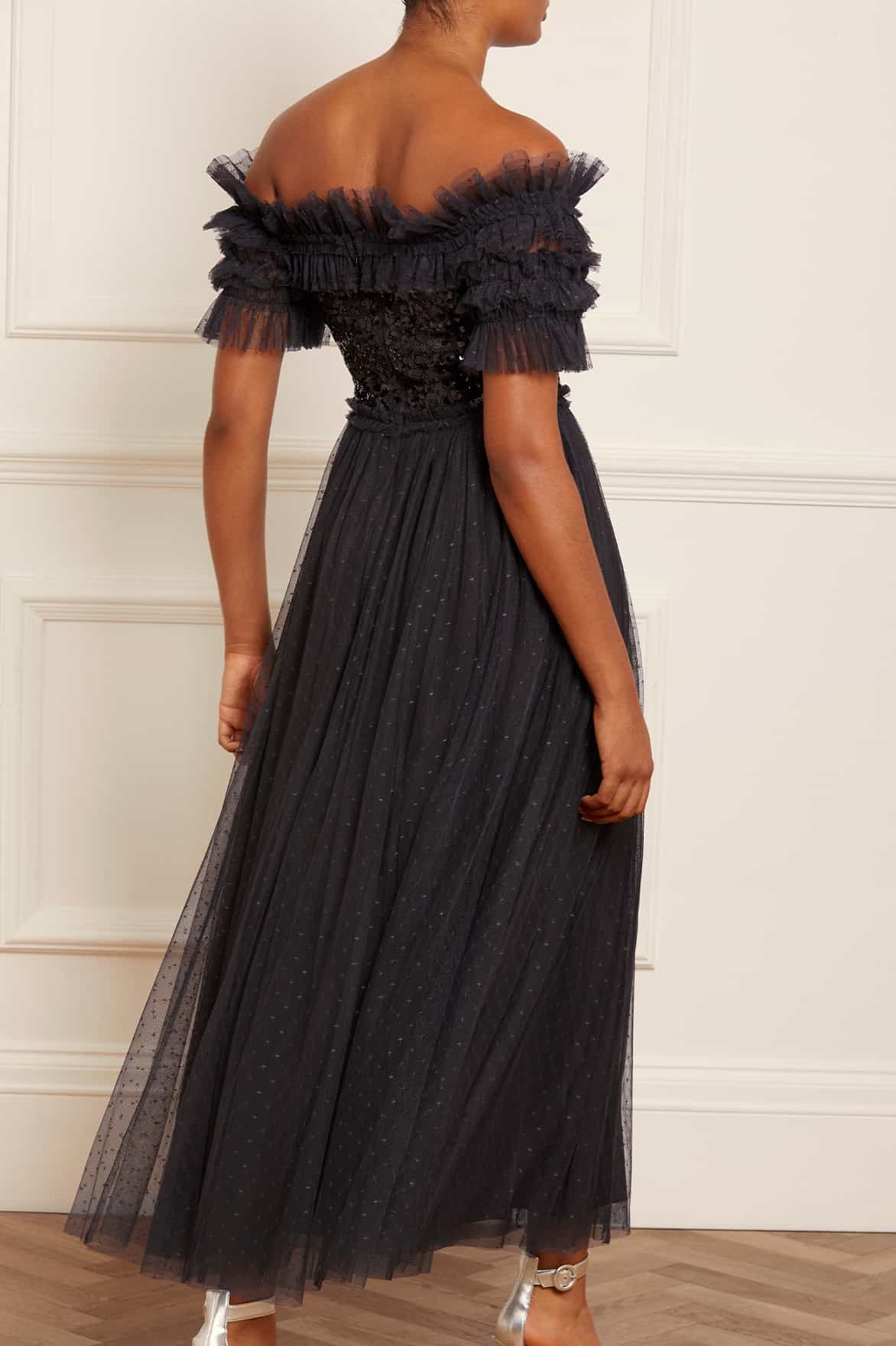 The Sequin Wreath Bodice Off-Shoulder Ankle Gown in Graphite. This beautiful gown is crafted with an iconic off-the-shoulder design. Adorned with layers of delicate ruffles, along with an elasticated panel for comfort and hold. The bodice is beautifully decorated with shimmering sequins inspired by a vintage lace curtain. Designed with a romantic layered tulle skirt for signature Needle & Thread styling. A perfect gown for a special occasion.