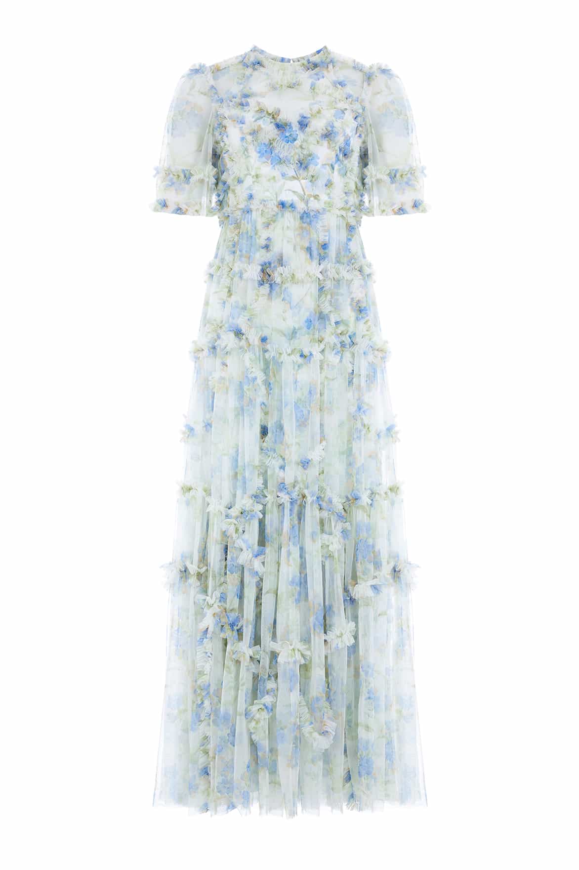 The Summer Posy Short Sleeve Gown in Moonshine. The print of this gown is taken from a 1930’s hand-painted wallpaper design. The artwork features a series of powder blue posies scattered in a soft formation. This signature Needle & Thread style is developed with delicate tulle, featuring intricate gathered ruffles engineered to create a flattering textile. Expect all eyes on you in this magical, fun piece.
