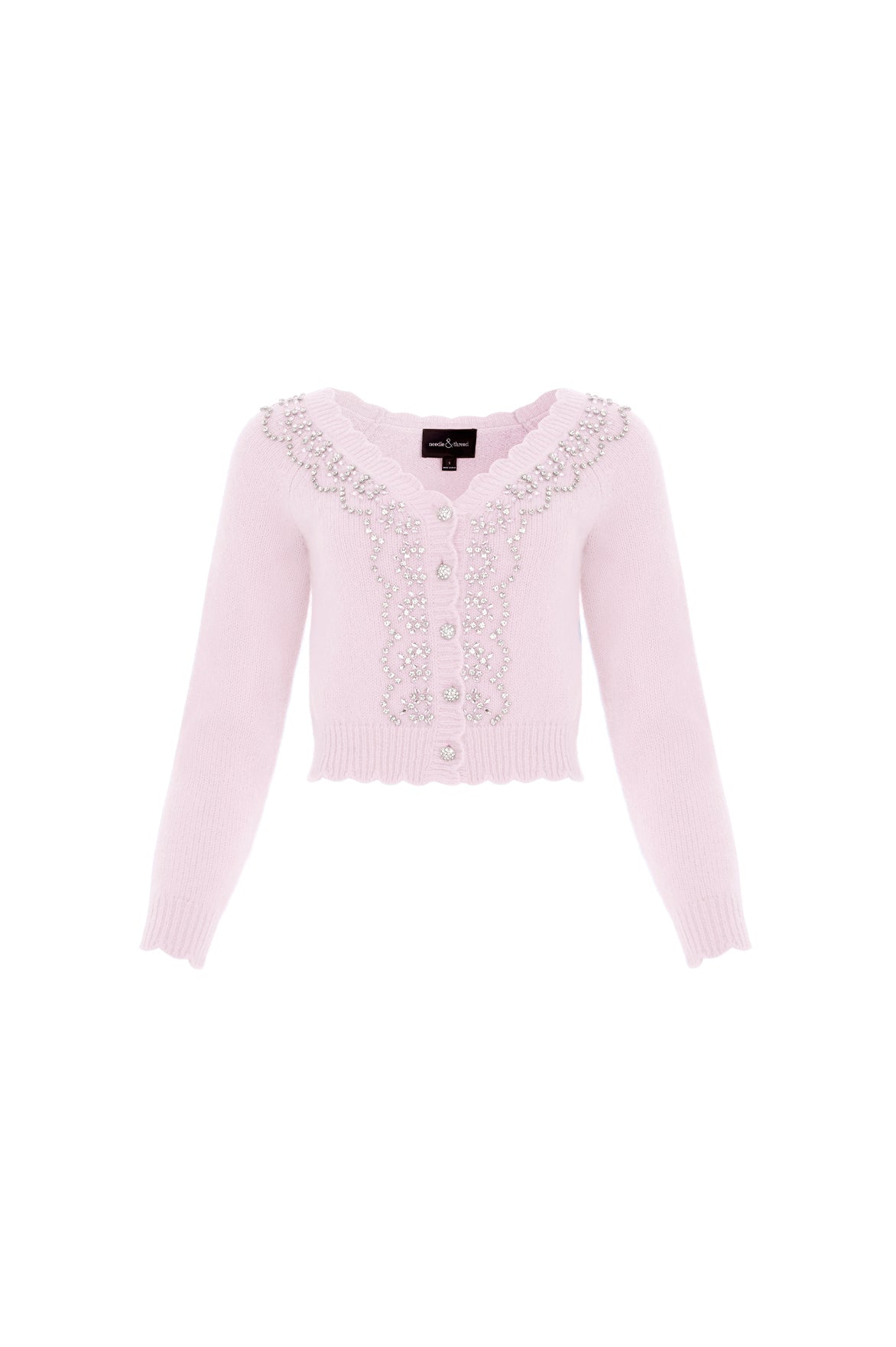 NEW SEASON | NEEDLE & THREAD EXCLUSIVE. The Embellished V-Neck Short Cardigan in Powder Pink. Delicately adorned with intricate embellishment for a refined, feminine finish. Designed with a flattering V-neckline and softly fitted silhouette, this piece offers subtle texture and light-catching detail.