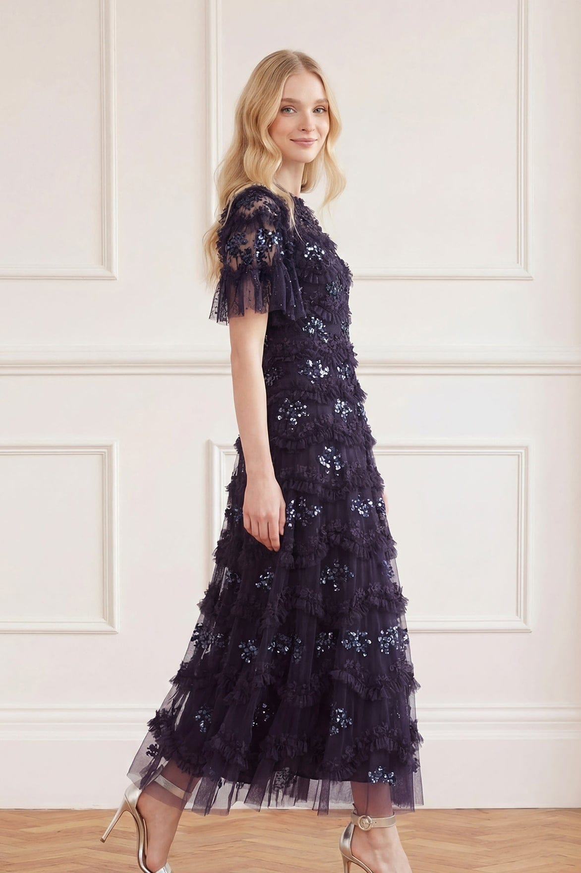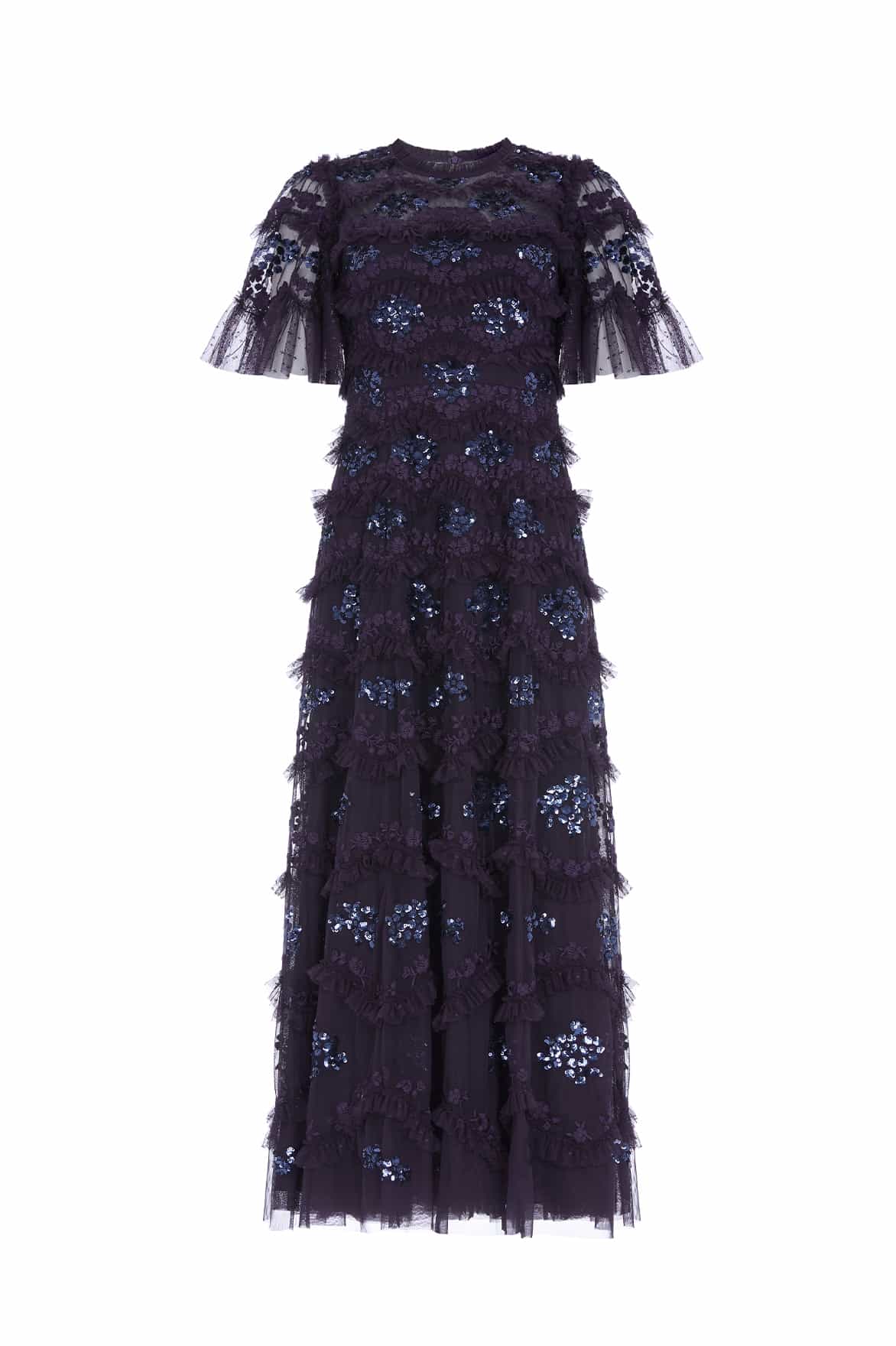 The Daisy Wave Ankle Gown in Midnight. Features delicate floral embroidery arranged in a soft wave pattern across a tulle base. The intricate artwork creates depth and movement, while the silhouette is designed to flatter with ease.
