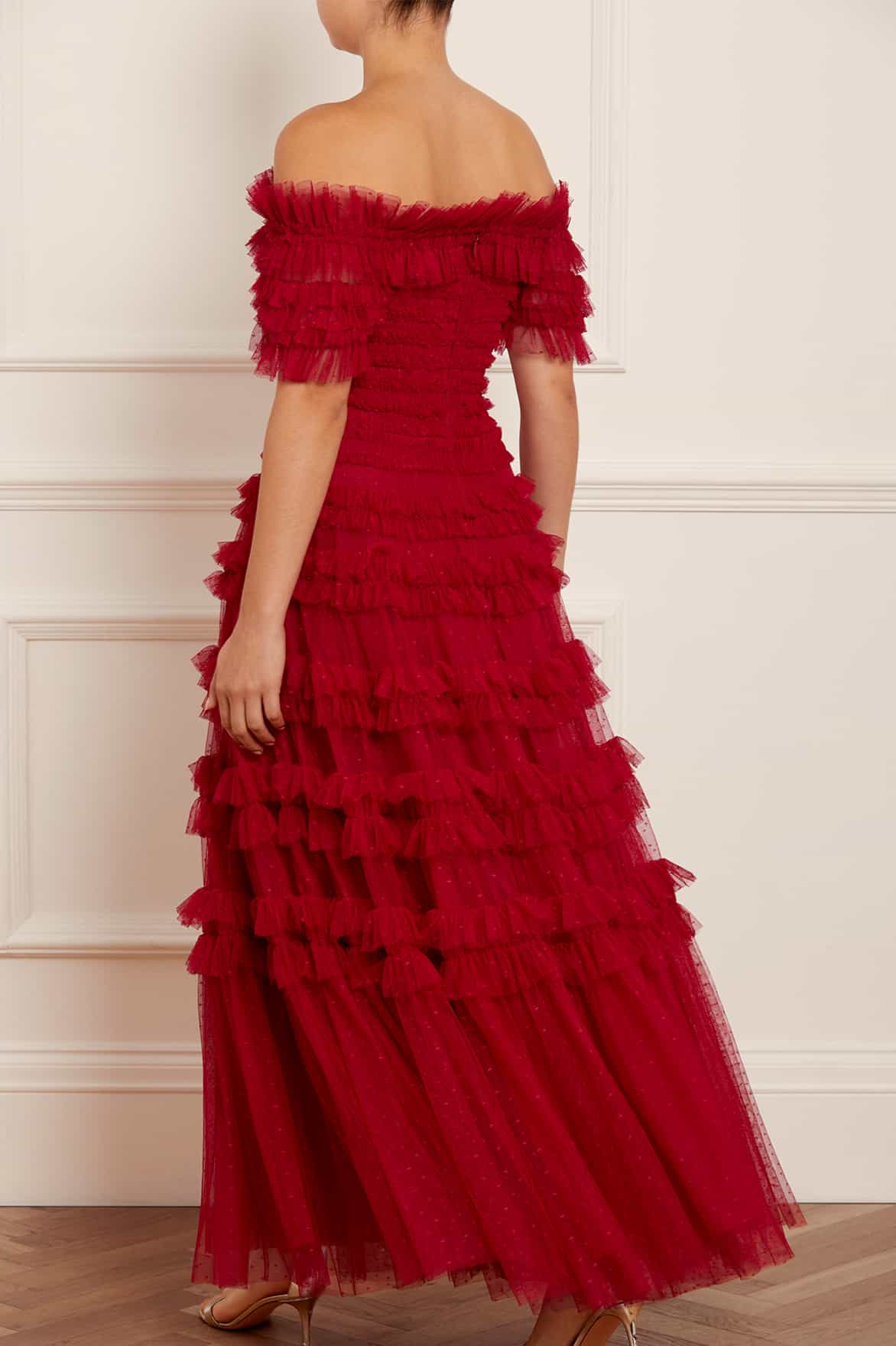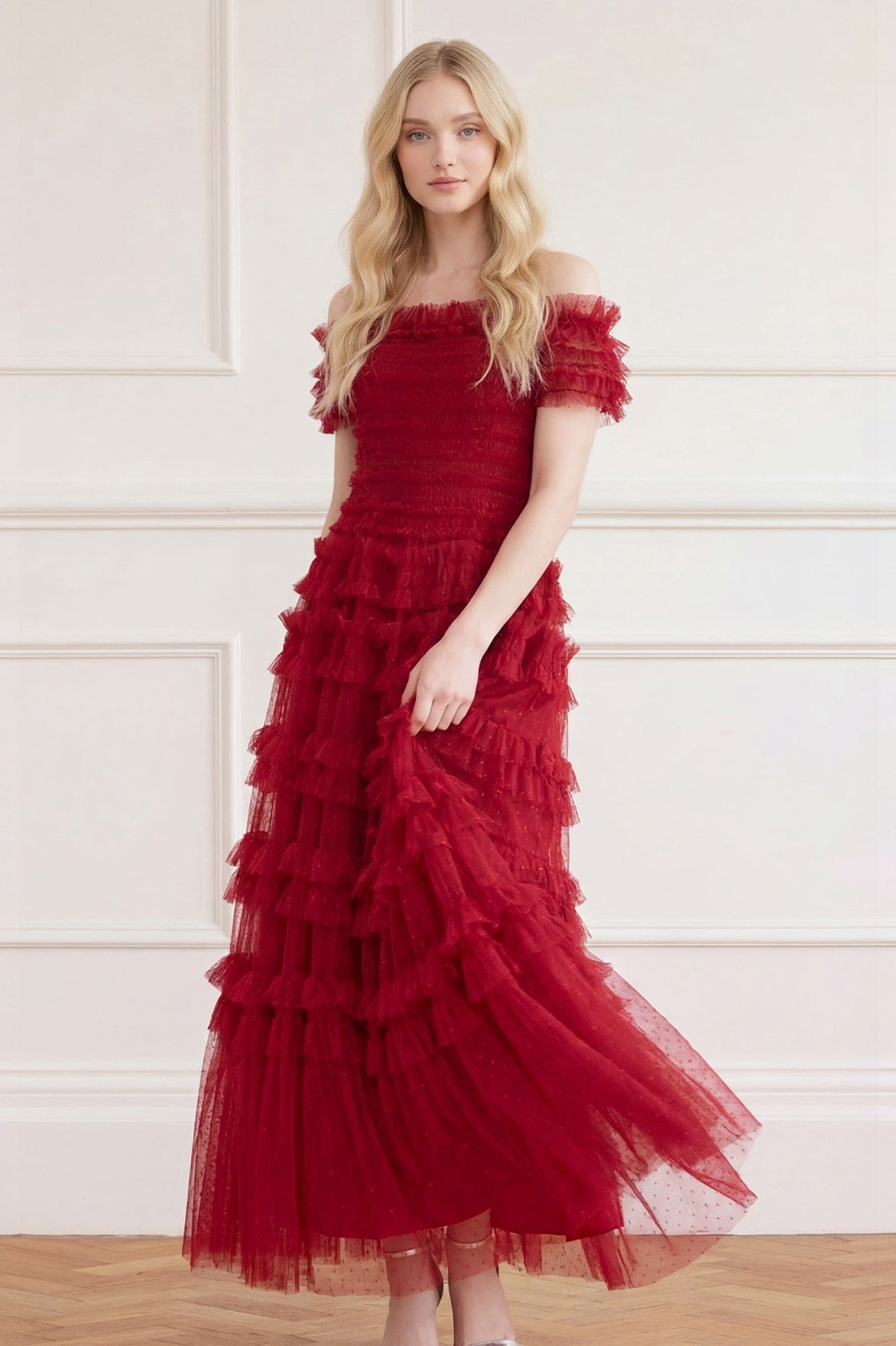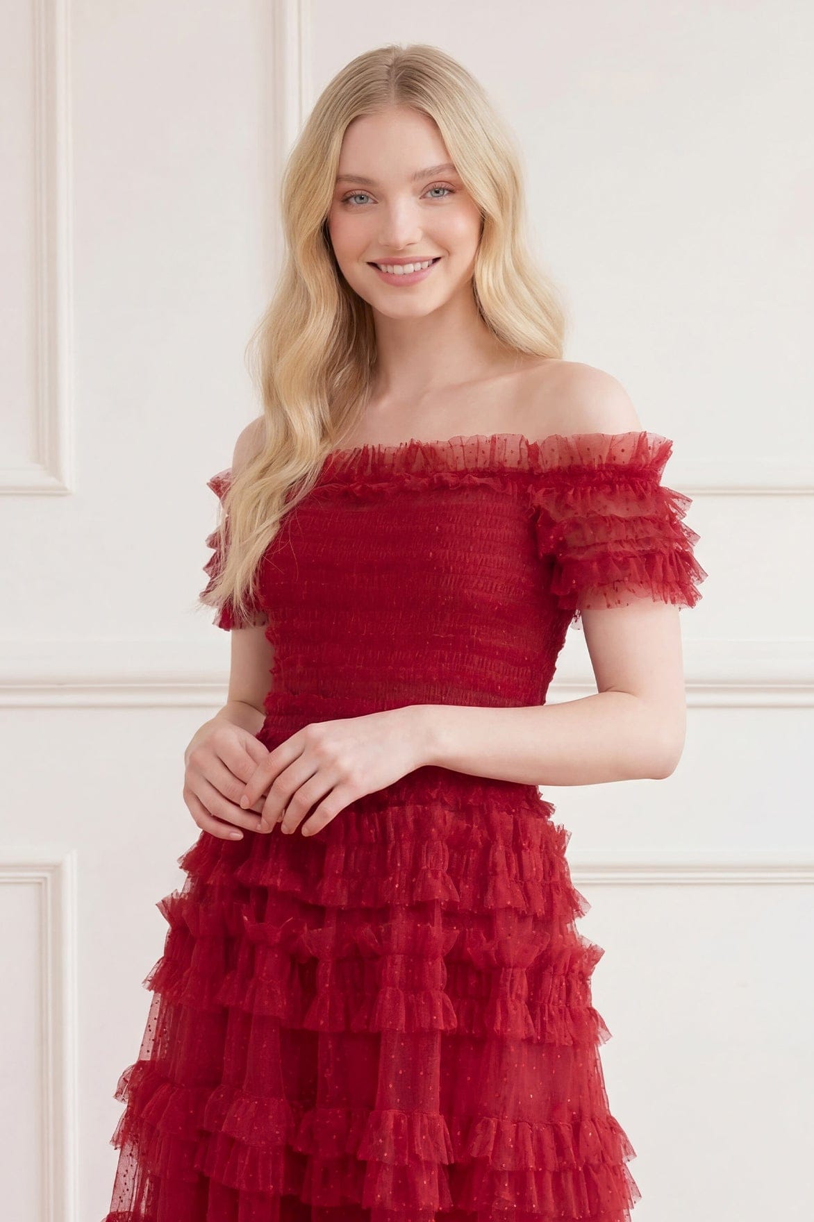 The Lisette Ruffle Off Shoulder Gown in Deep Red. This statement gown has an elegant off-the-shoulder design inspired by Hollywood styling. Crafted with textile tulle and double-stitched frills for a dramatic, romantic effect. Features an integrated corset for a perfect fit and to hold the silhouette. Expect all eyes on you in this romantic gown.