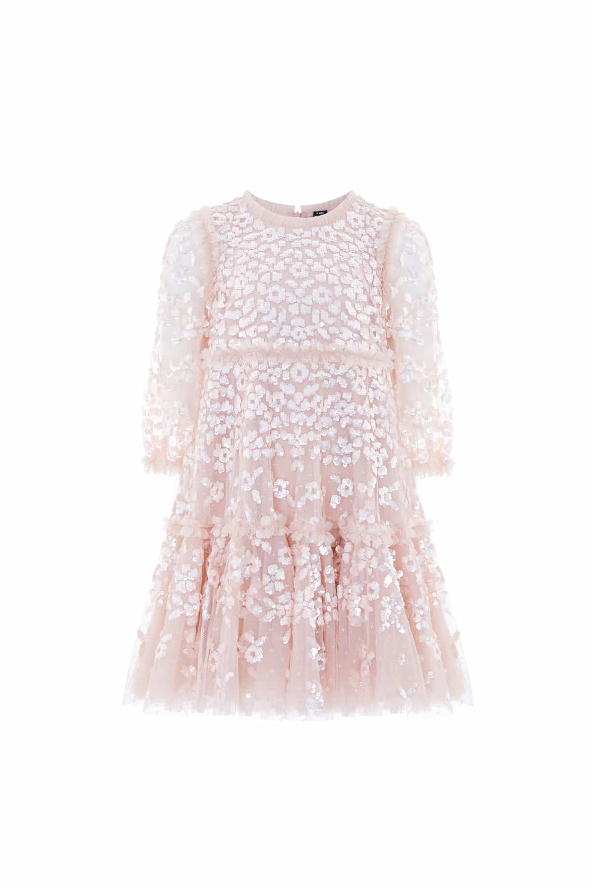 NEEDLE & THREAD EXCLUSIVE. The Maeva Long Sleeve Kids Dress in Pearl Pink is a Needle & Thread exclusive, featuring floral sequin motifs on the bodice and trailing floral borders fading towards the hem. Designed with foil-coated sequins add a lustrous shine, while the gathered skirt tier with a frothy ruffle gives it volume for twirling. Delicate tulle frills at the neckline, shoulders, and yoke complete this timeless, heritage-inspired design.