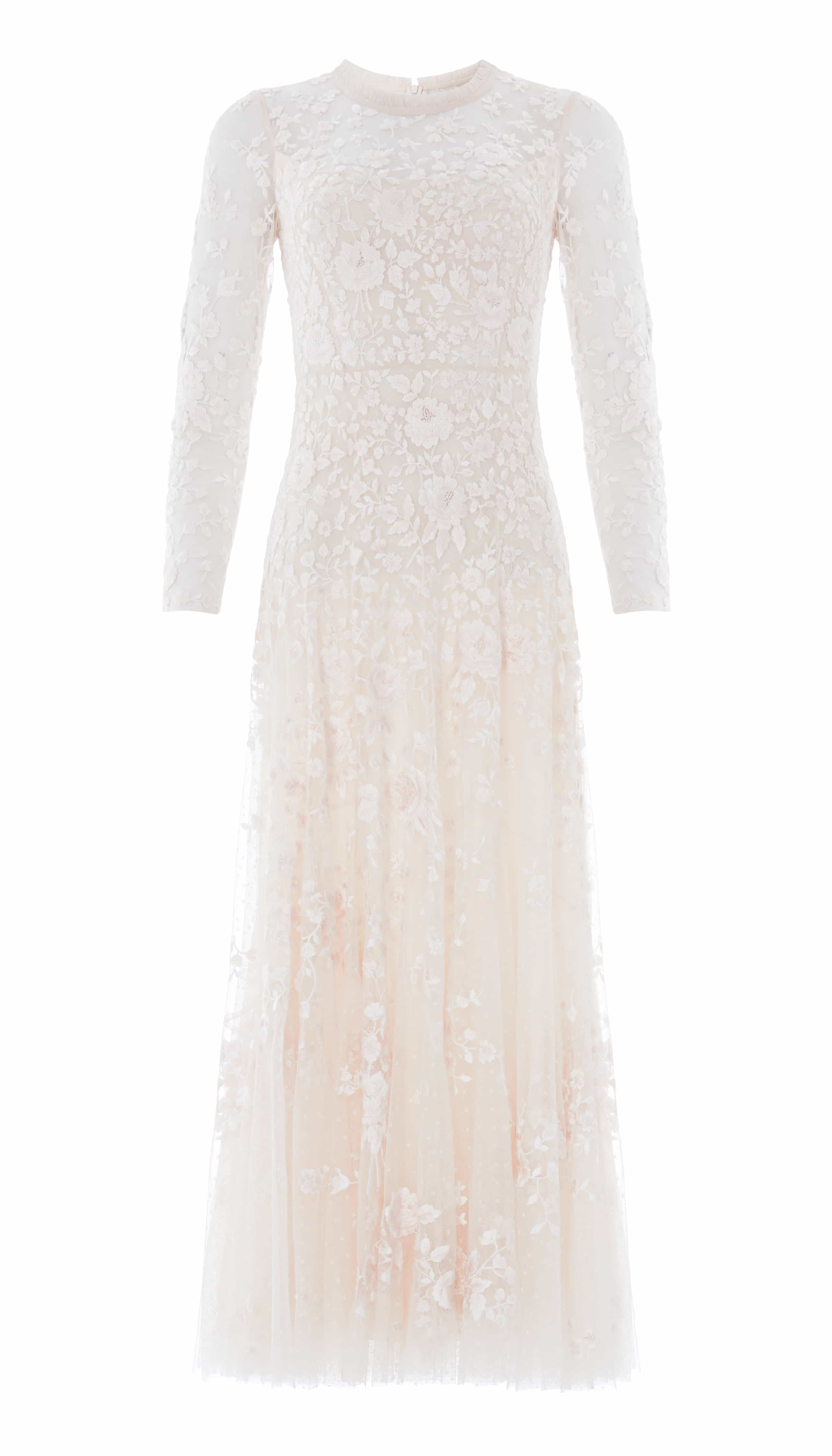 NEW SEASON. The Rosa Round Neck Ankle Gown in Swan White/Cream. Inspired by romantic garden florals, this elegant gown features delicate Rosa embroidery arranged across a softly flowing silhouette. Designed with a round neckline and ankle-length skirt for timeless, refined occasionwear.