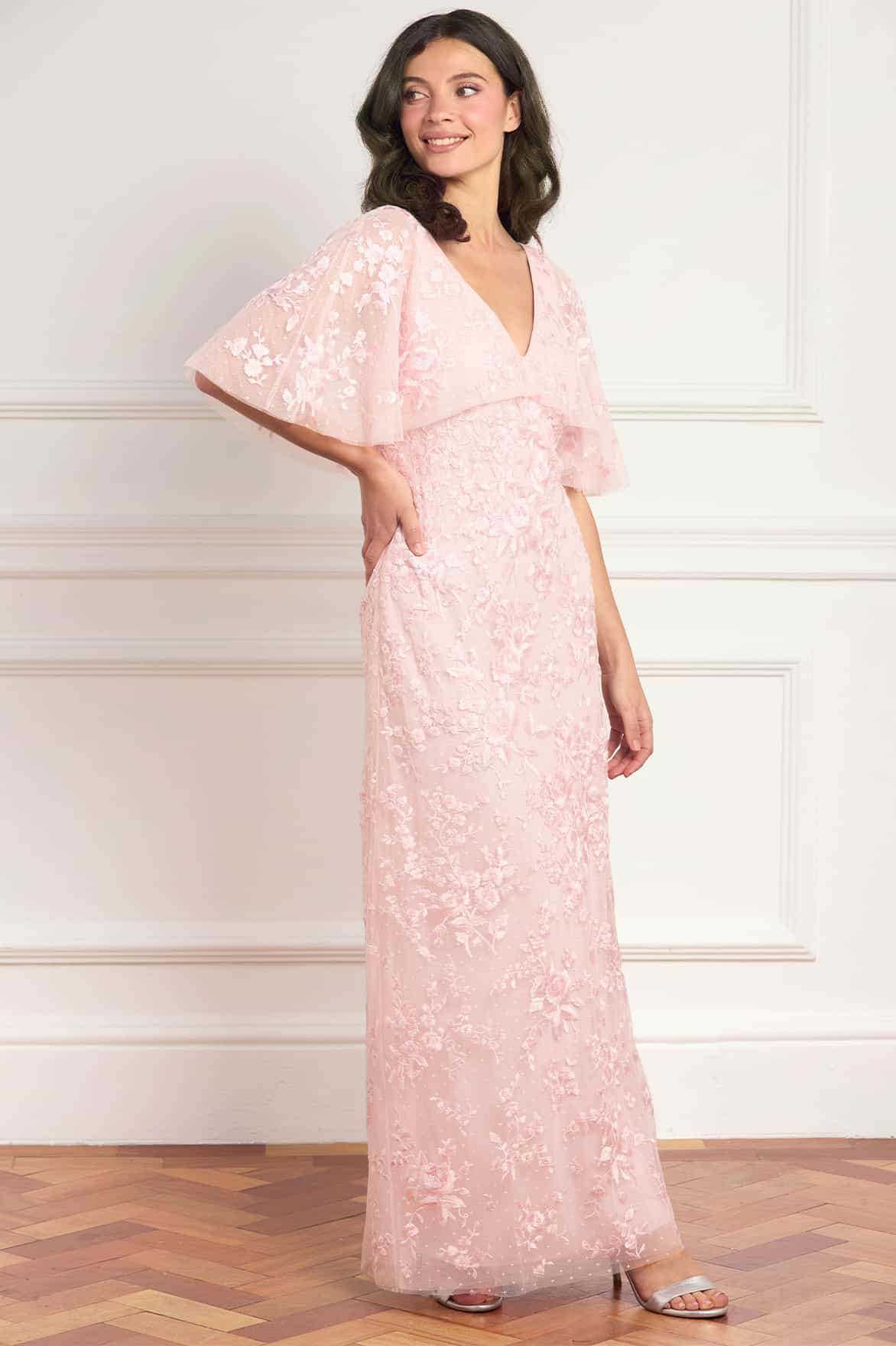 NEW SEASON. The Rosa V-Neck Cape Gown in Peony Pink. Adorned with delicate floral embroidery inspired by early 1900s artwork, this gown offers a refined, romantic silhouette. Finished with an integrated cape and a slim fit, enhanced by a bias-cut lining for fluid movement.