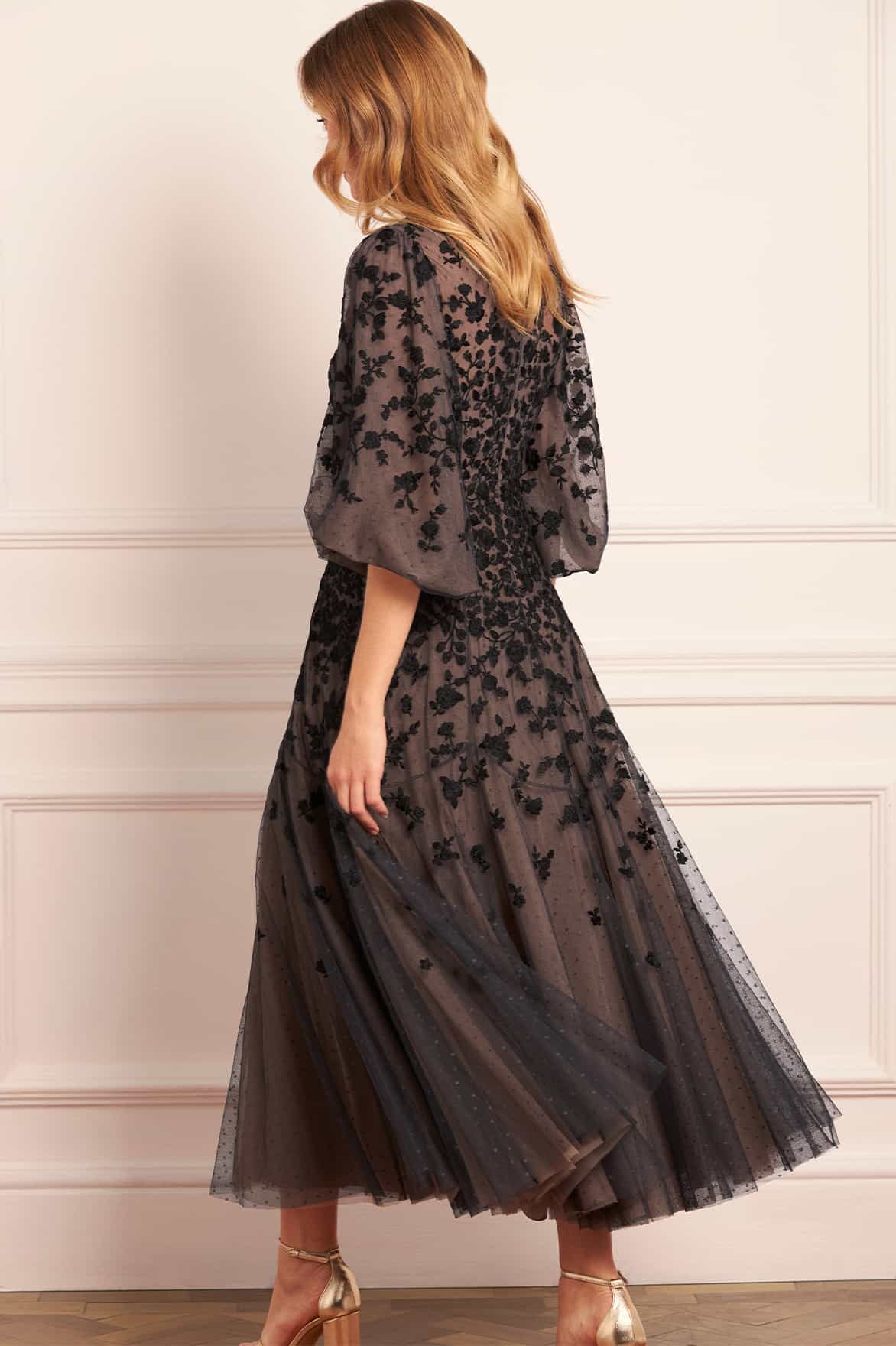 NEW SEASON. The Sylvia Rose Round Neck Ankle Gown in Graphite/Warm Taupe. Floral embroidery cascades into scattered motifs across airy tulle layers. The round neckline and slim cut are balanced by the moody graphite and taupe palette, grounding its femininity with sophistication.