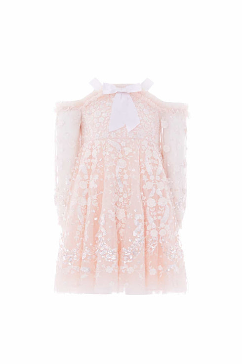 NEW SEASON. The Adeline Off-Shoulder Kids Dress in Opal/Cream. A soft, elegant piece with signature Needle & Thread charm. Victorian-inspired floral motifs and scalloped embroidery brings whimsical detail to the layered tulle. Perfectly pairs with the women’s Adeline Gown in the same colourway for matching occasionwear.