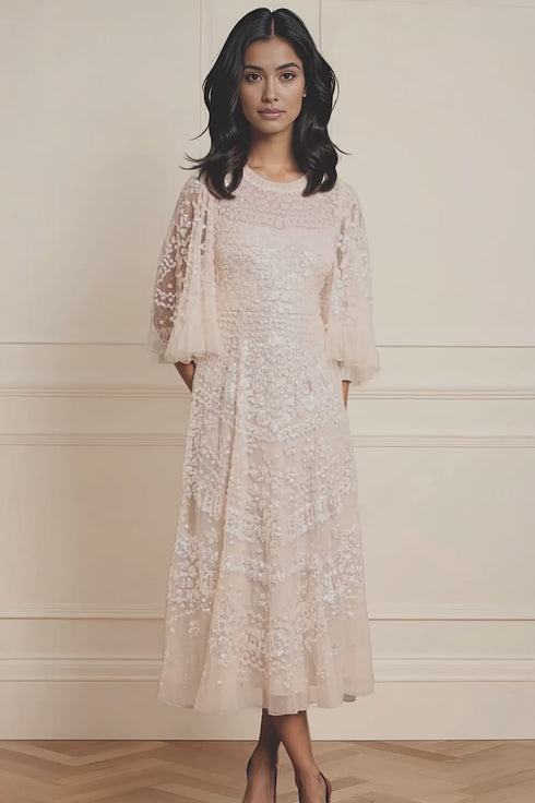 NEEDLE & THREAD EXCLUSIVE. The Anais Sequin Ballerina Dress in Cream/Dusk Pink. This beautiful statement style is inspired by charcoal drawings of vintage French lace from the early 1900s. This shimmering sequin dress features a dense border design, creating a lustrous effect. Designed with a romantic fluted sleeve featuring a deep gathered frill at the cuff for ethereal styling. The neckline and shoulders are adorned with signature Needle & Thread tulle ruffles. This is one of Needle & Thread's heritage pieces from the archive - A signature timeless piece.