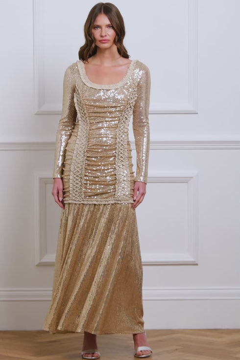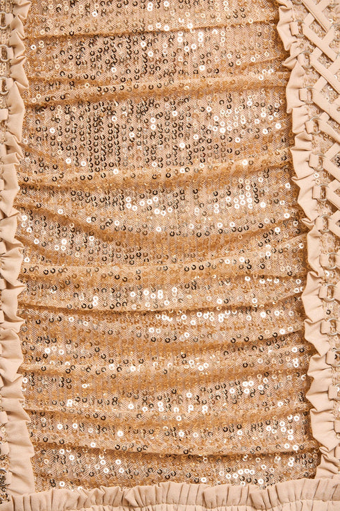 The Arabella Long Sleeve Gown in Parchment/Metallic. This statement piece has a slim, flattering silhouette. It is crafted from a stretch mesh base and features intricate sequin detailing that creates a captivating shimmer. The body is softly ruched, with a drop hem tier adorned with satin frills. Designed with satin lace-up detailing, threaded through silver eyelets, accentuates the gown's contour. Developed with long, slim sleeves gently gathered and embellished with sequins for added elegance. The epitome of luxury and glamour.
