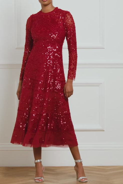 NEEDLE & THREAD EXCLUSIVE. The Aurora Ballerina Dress in Cherry Red. This light-catching ankle-length dress is decorated with red shimmering sequins, and was inspired by a vintage lace tablecloth. The Aurora Ballerina is a long-sleeve dress with pretty floral elements, and a flattering silhouette. There is delicate frill lace detailing around the neck and arm for further intrigue. Style yours with an on-trend hair ribbon for the perfect look.