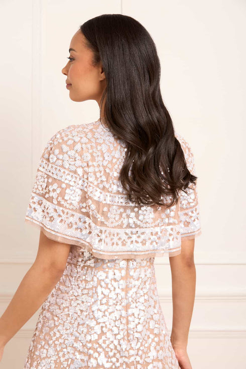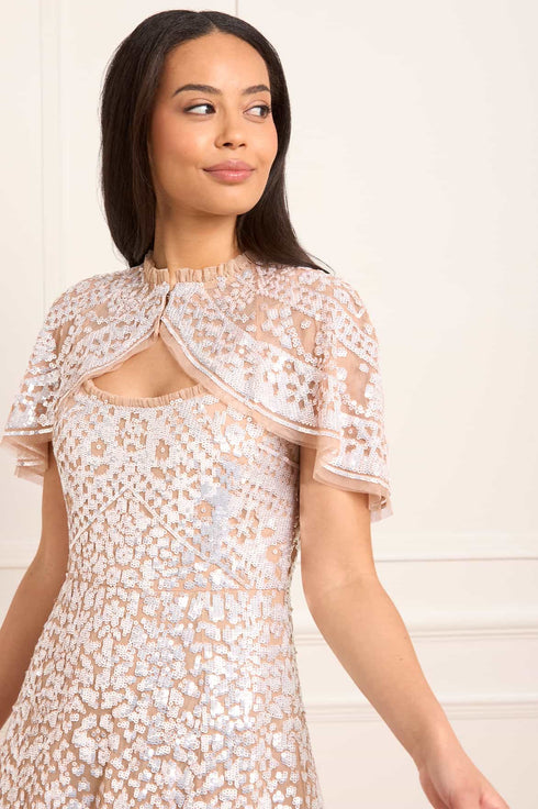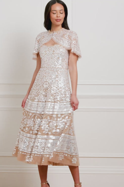 The Aurora Short Cape in Butterscotch/Cream is a standout piece for the season, inspired by the intricate beauty of early 1900s antique tablecloths. Crafted with a delicate placement border design, this cape shimmers with countless sequins, creating a timeless, luminous effect. The short silhouette is finished with a soft, ruffled neckline trimmed in signature Needle & Thread tulle frills, adding a romantic flourish. Designed to complement the Aurora Scoop Neck Ballerina Dress, it fastens elegantly at the front with two silver metal hook-and-eye closures. A refined layering piece, perfect for adding sparkle and sophistication to any occasion.