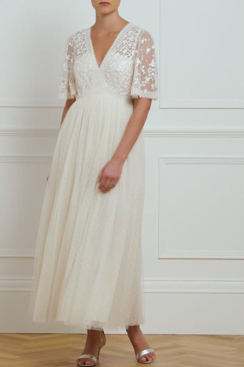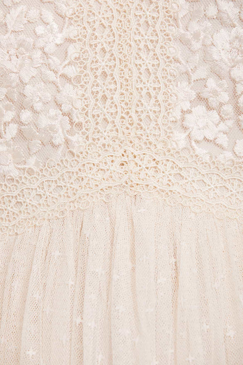 The Celestia Ribbon Bodice Ankle Gown in Cream. The bodice of this gown has been intricately designed with embroidery inspired by vintage lace, featuring delicate floral motifs and ribbon bows. Crafted with pretty lace trims for signature Needle & Thread detailing, and delicately constructed with a textured tulle fabric skirt. A Needle & Thread contemporary piece.