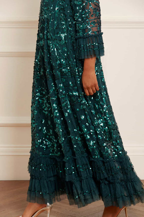 The Celia Long Sleeve Ankle Gown in Emerald. This statement gown is designed with romantic artwork featuring ornate florals and ribbon bows, densely embellished with shimmering sequins for exquisite detailing. Designed with an effortless loose fit with soft, playful tulle frills on the hem and cuffs. A key piece in our collection.