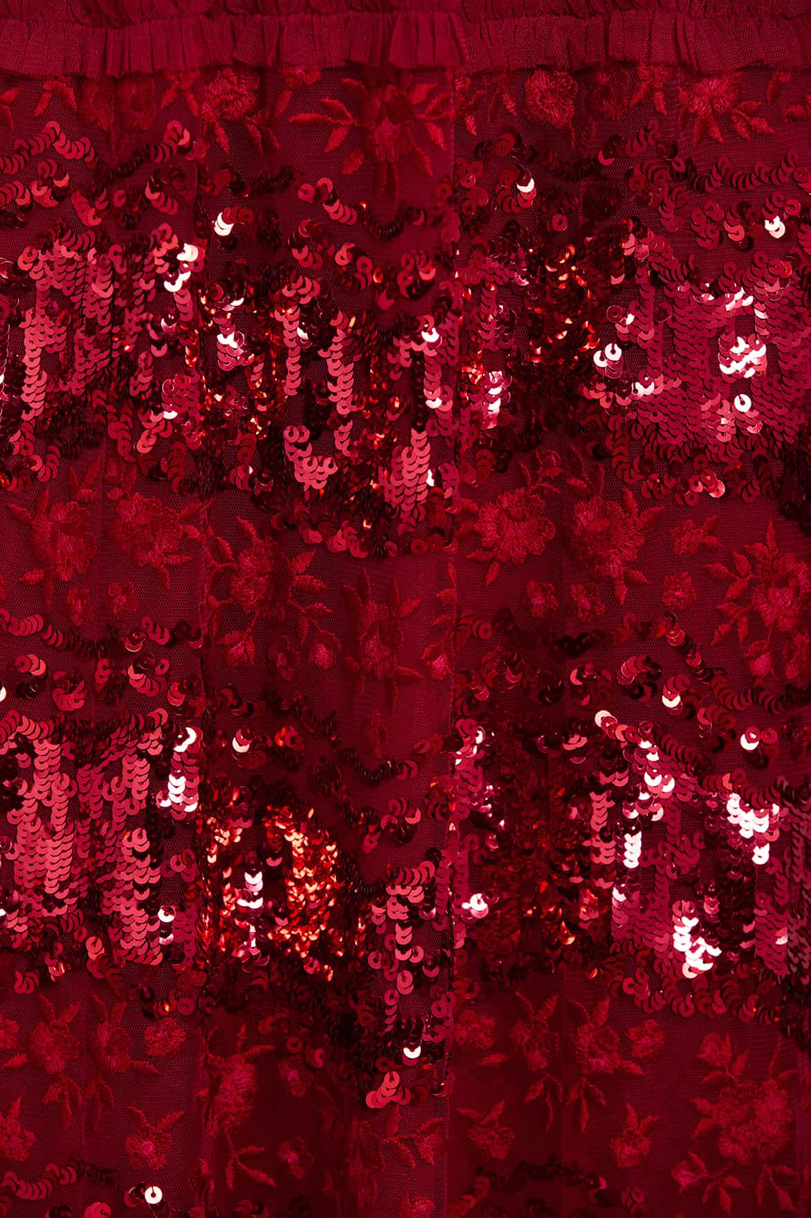 The Chantilly Sequin Micro Mini Dress in Deep Red. A signature silhouette for Needle & Thread, featuring double layers of net to hold this elegant shape for the most flattering look. The artwork is inspired by 1930s styling, featuring floral embroidery in rich tonal shades and high impact sequin stripes. Make time to shine in the Chantilly